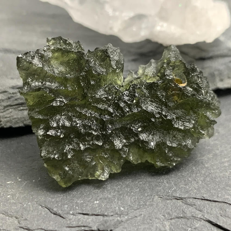 Called the Tears of Heaven, Moldavite is a rare tektite, a natural glass, formed from a meteorite collision nearly 15 million years ago. A piece of Moldavite, when seen in the best light, illuminates the intensity of this mysterious and gorgeous stone. Moldavite has olive-green color that ranges from pale and translucent to varying hues of deep forest greens with occasional streaks of brown.