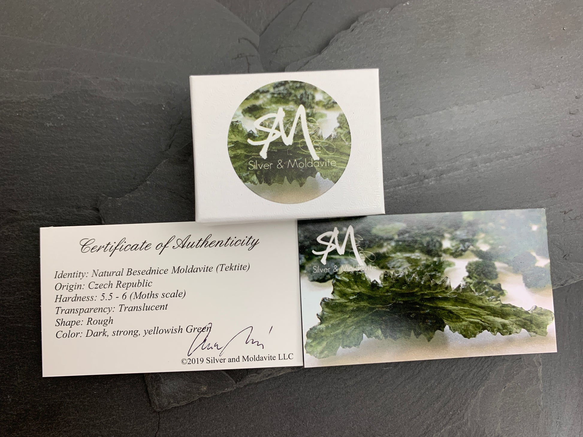 All Moldavite sold by Silver & Moldavite, LLC is genuine and comes with a certificate of authenticity. Our Moldavite is ethically sourced from legal mines in Chlum, Czech Republic.
