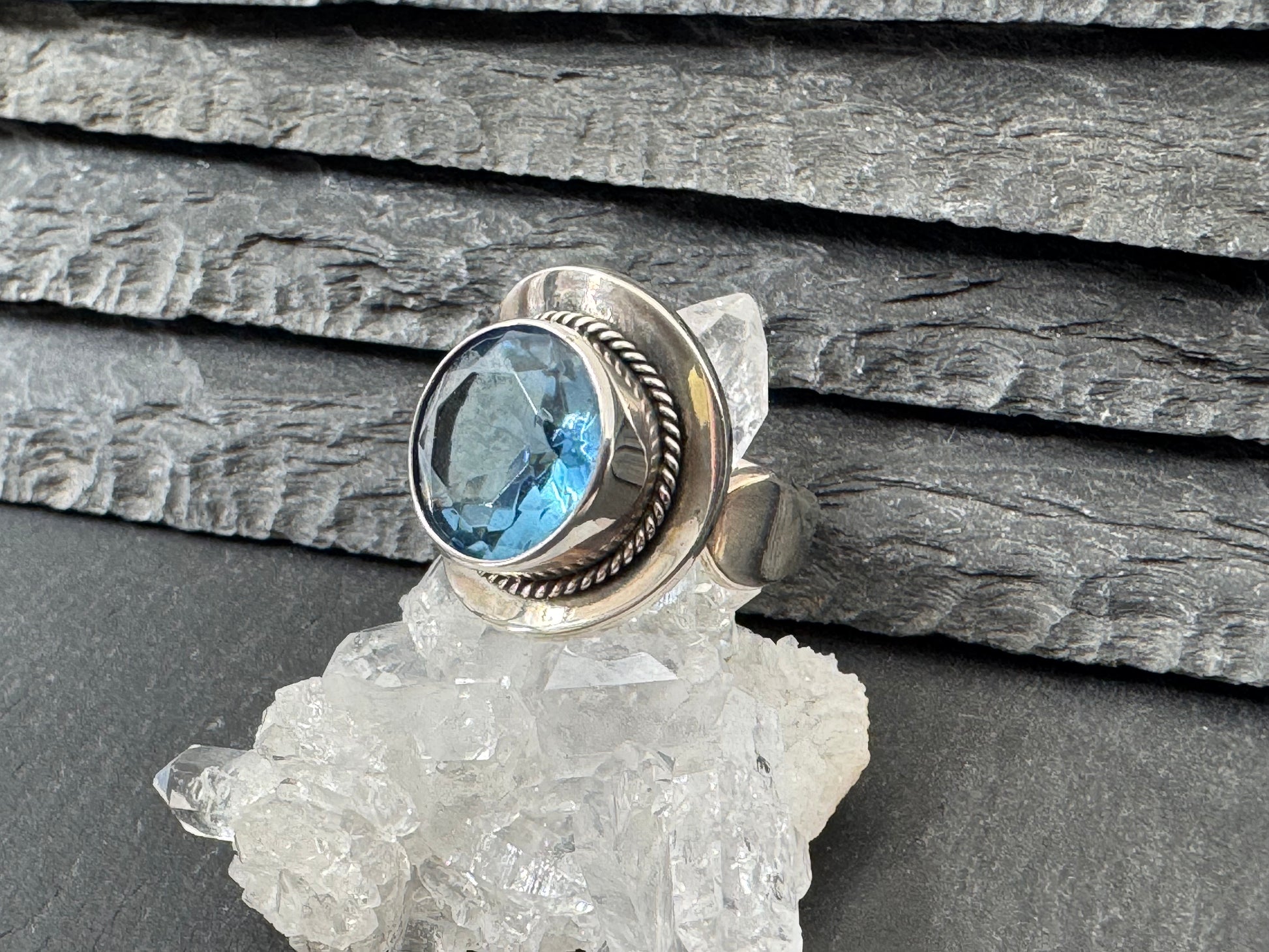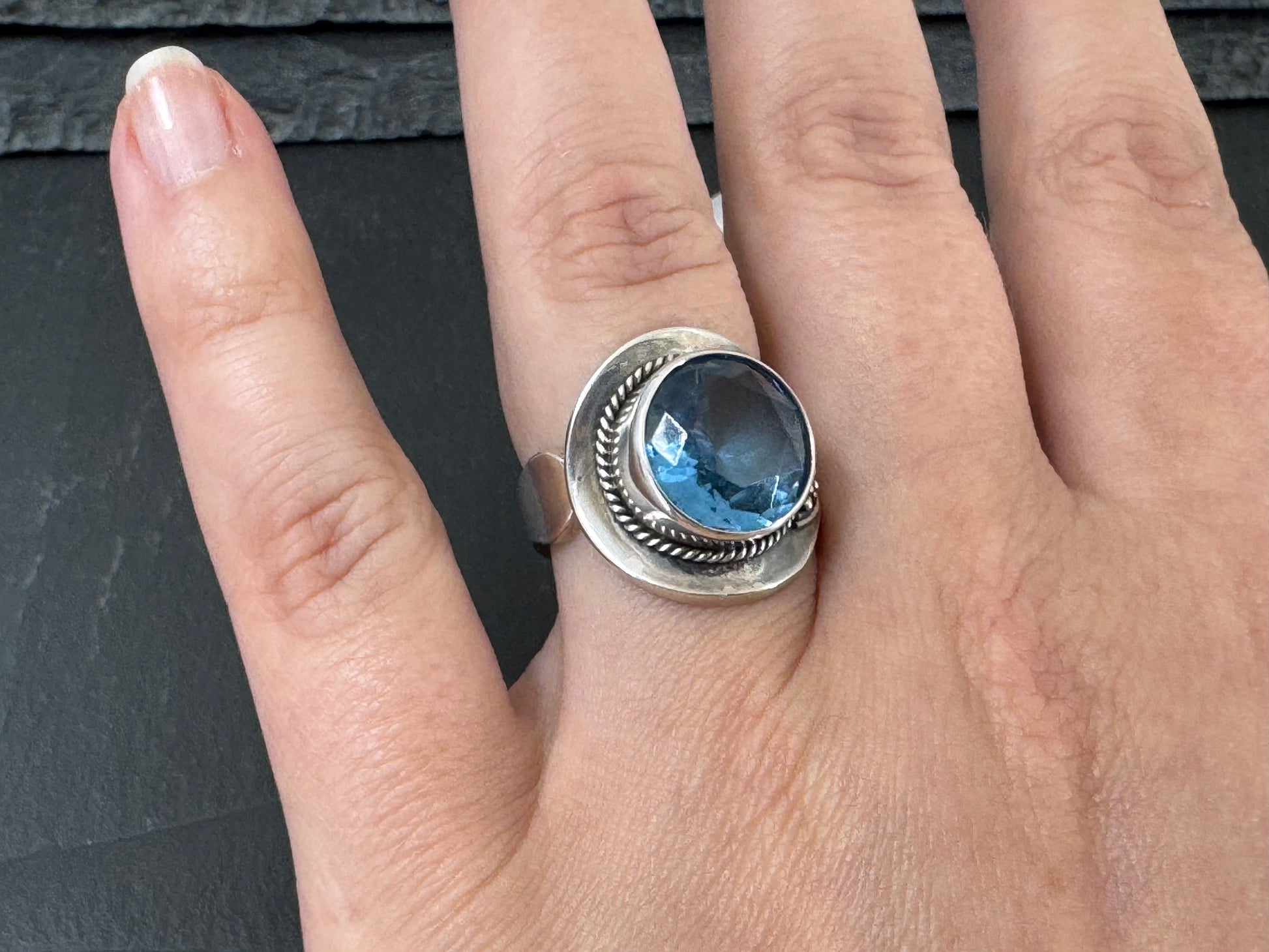 Genuine faceted Sky Blue Topaz ring in Sterling Silver. Ring size can be a little adjusted, ring ban is open.