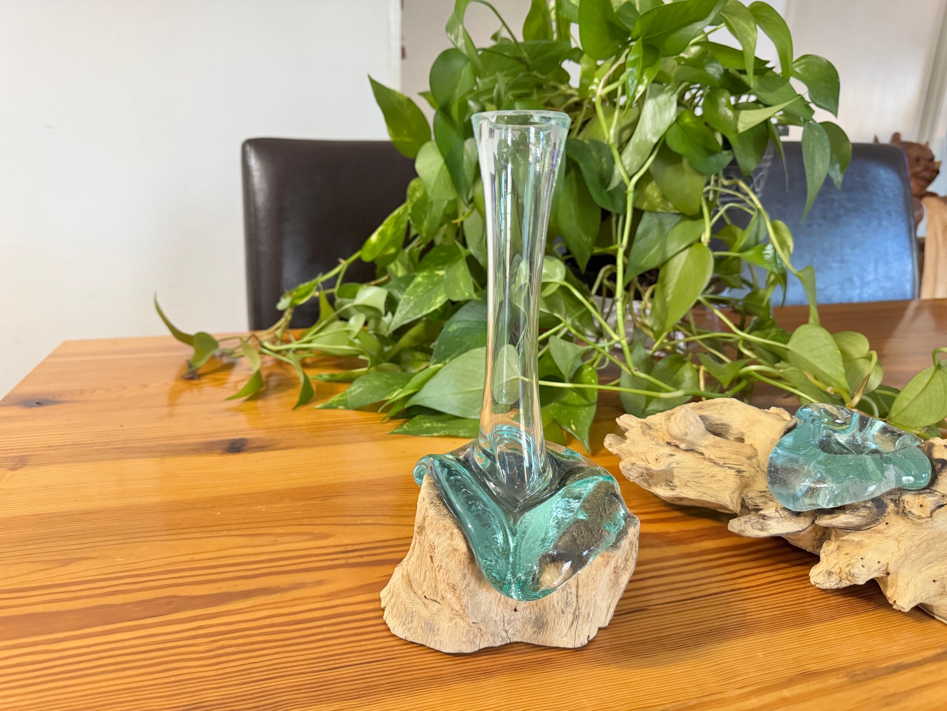This one-of-a-kind bud vase features hand-blown molten glass shaped directly over natural driftwood, creating a striking fusion of organic wood and flowing glass. The clear glass vessel rises elegantly from a softly aqua-tinted glass base, capturing movement, texture, and light in a truly sculptural form.