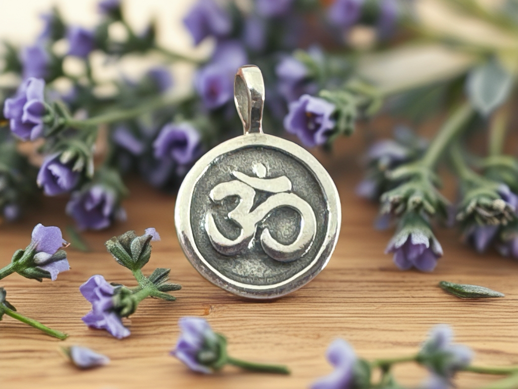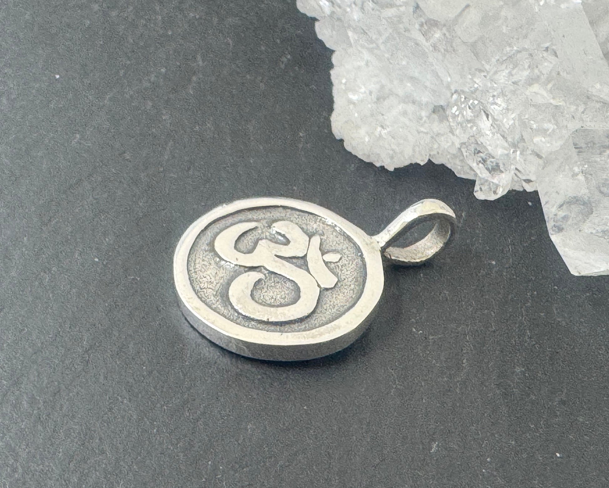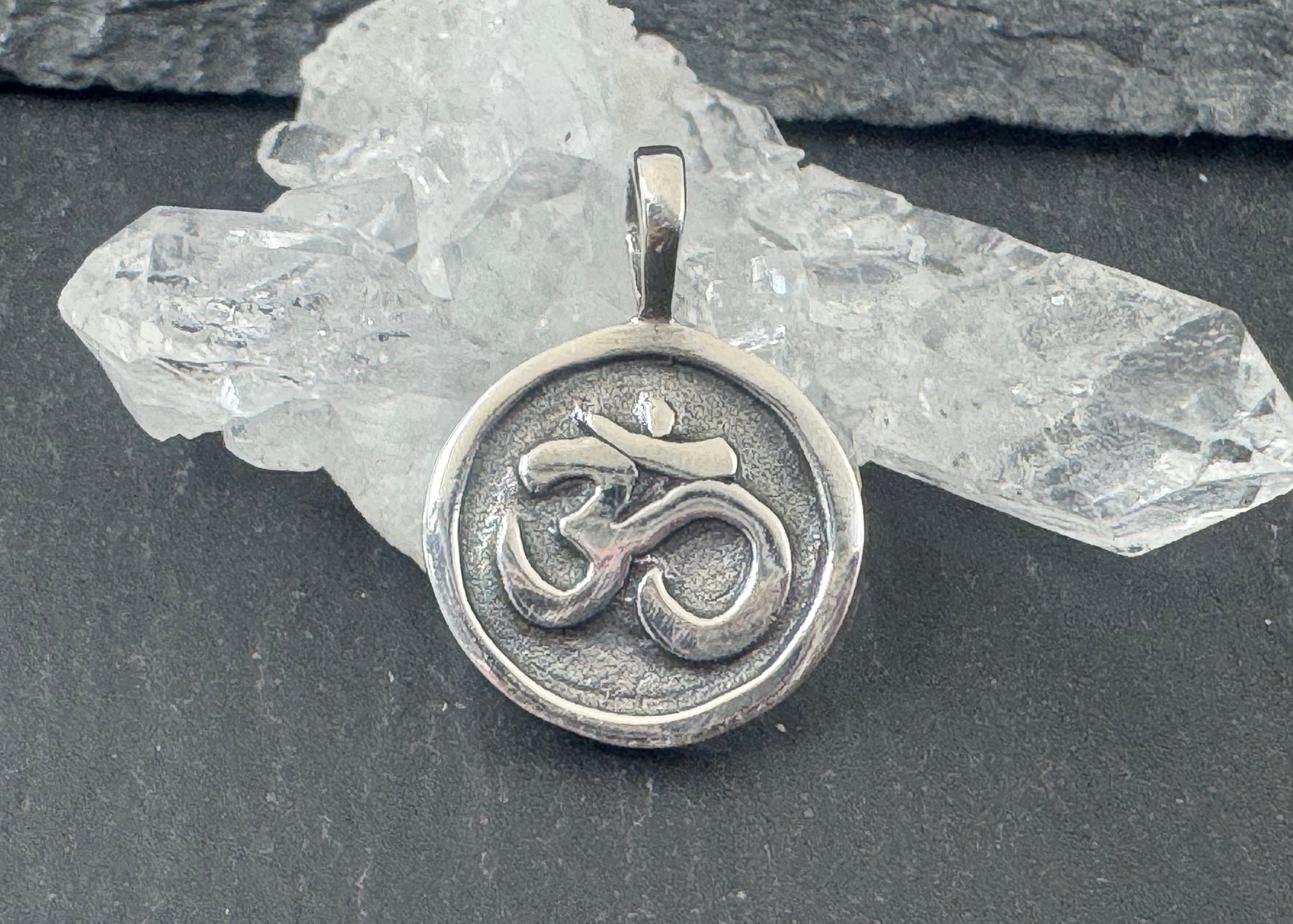 Sterling silver Om pendant embodies peace, unity, and spiritual energy.