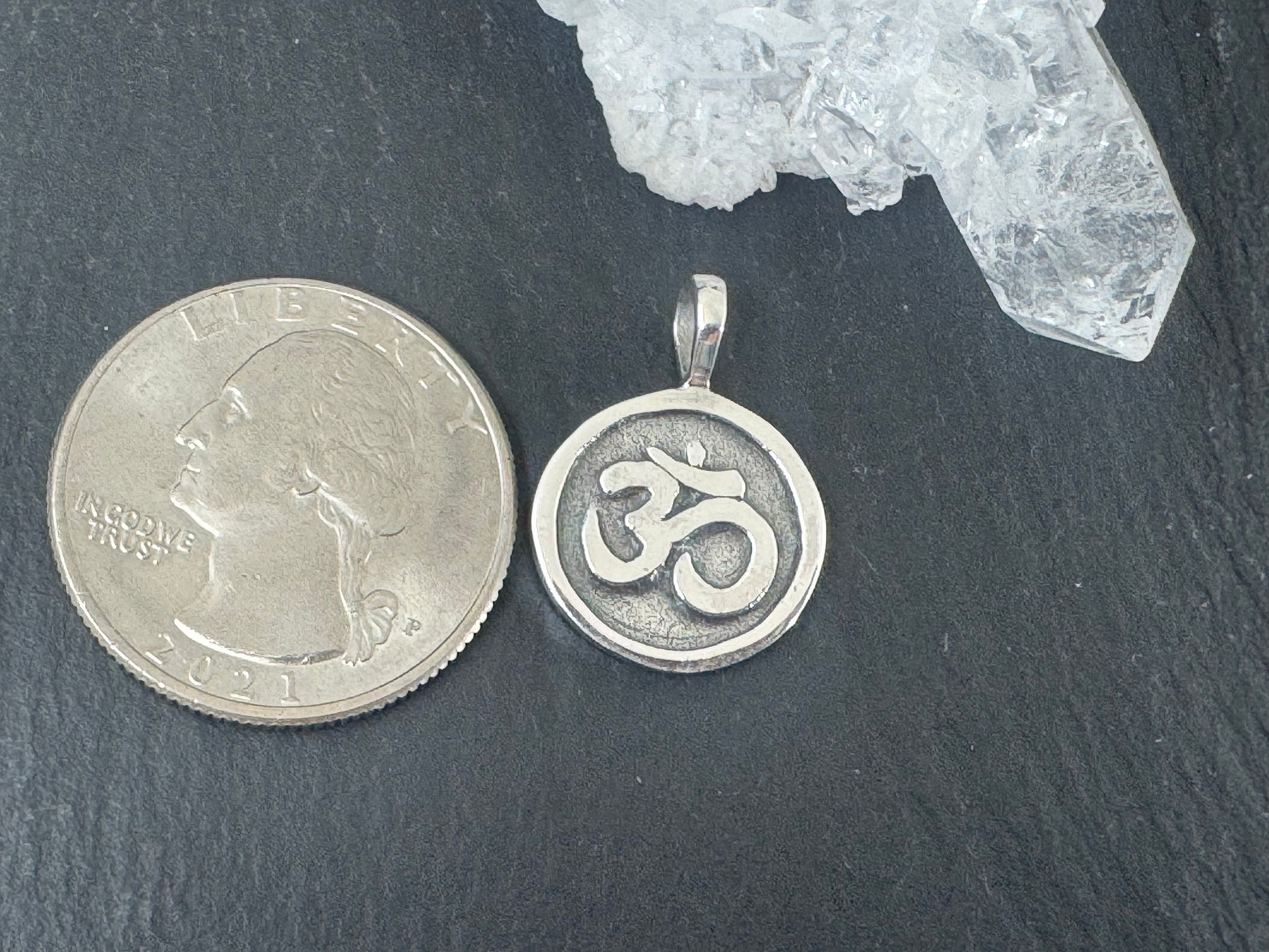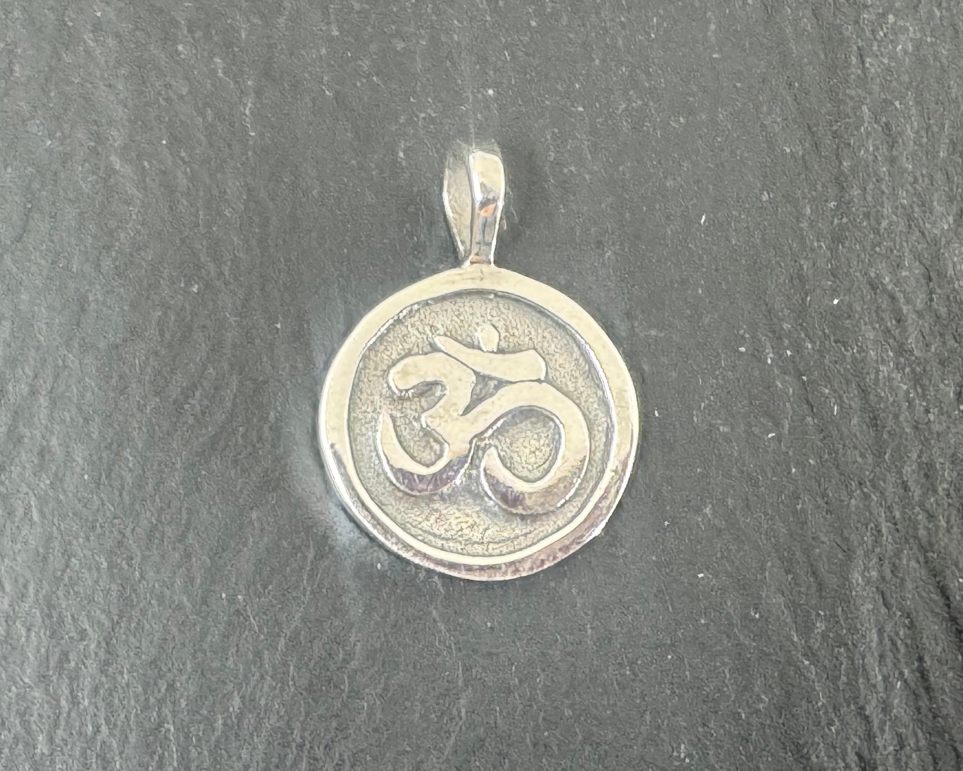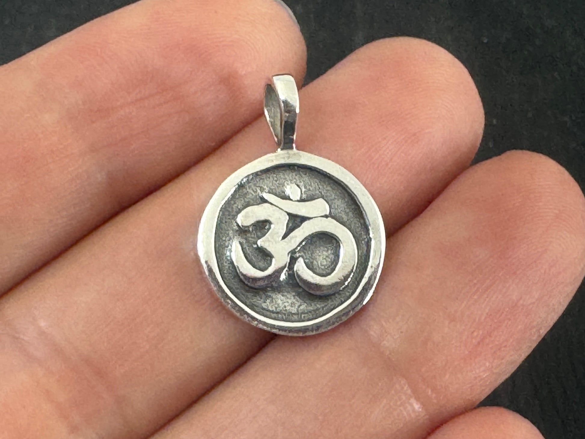 Sterling silver Om pendant embodies peace, unity, and spiritual energy.
