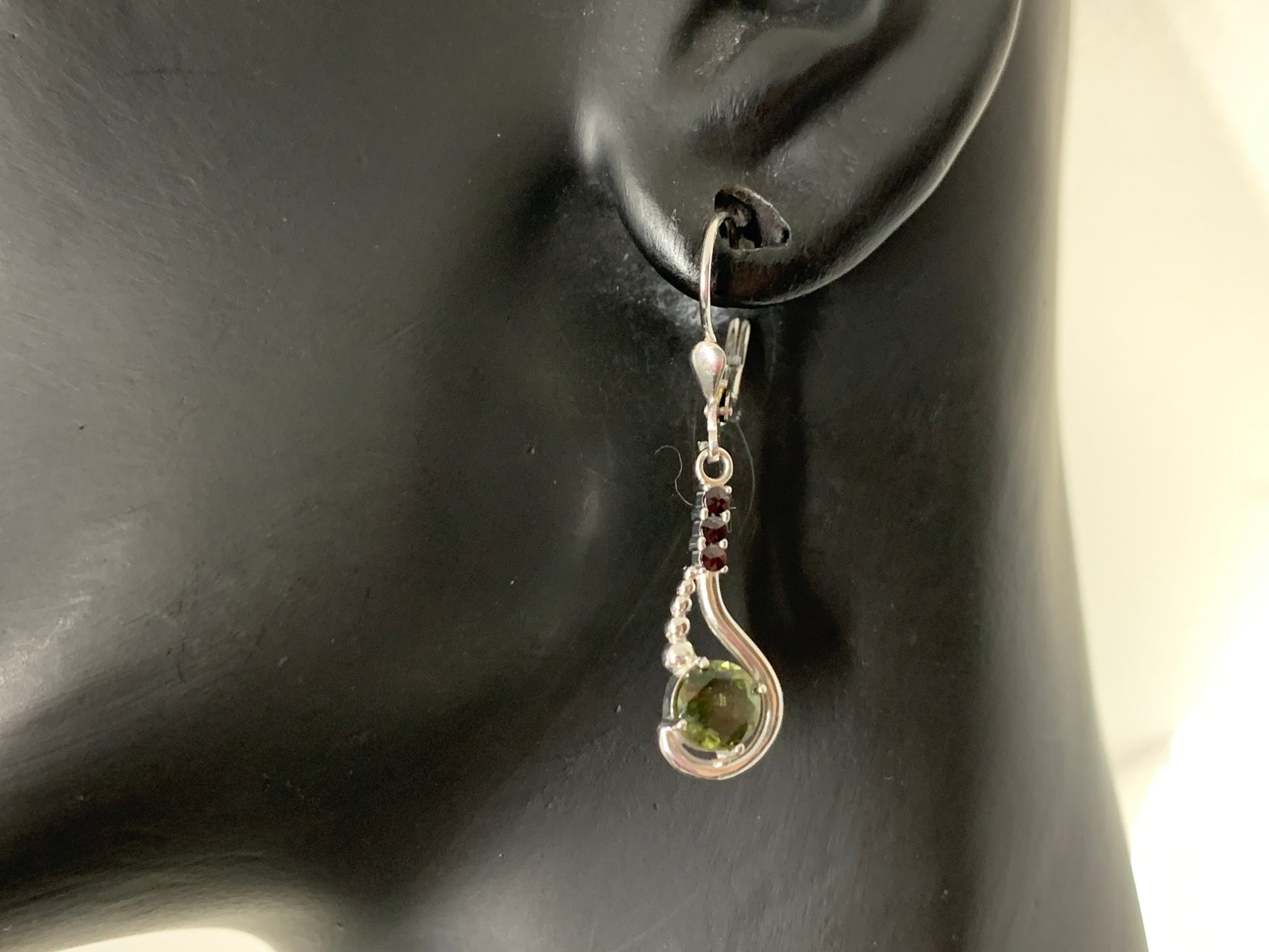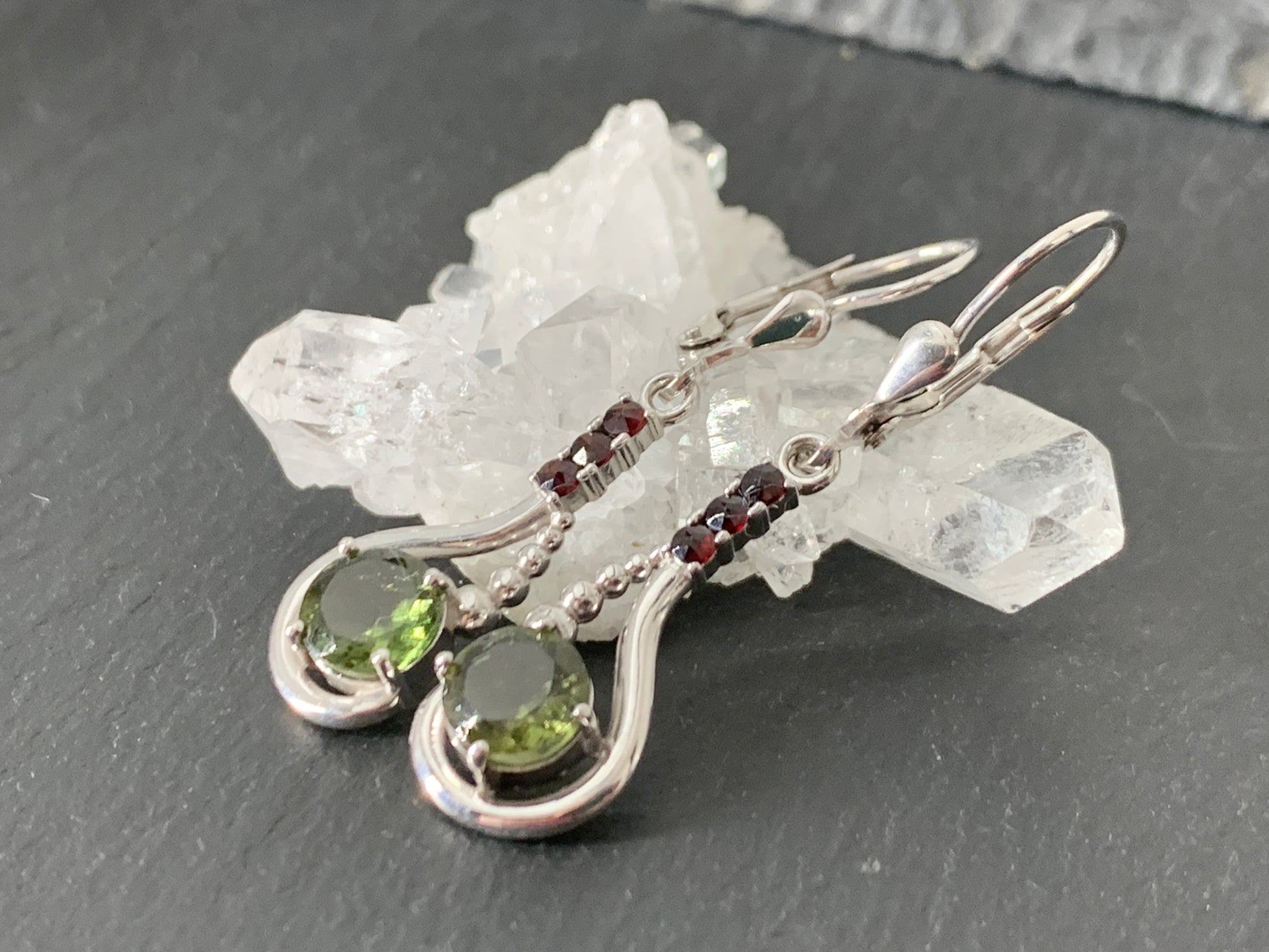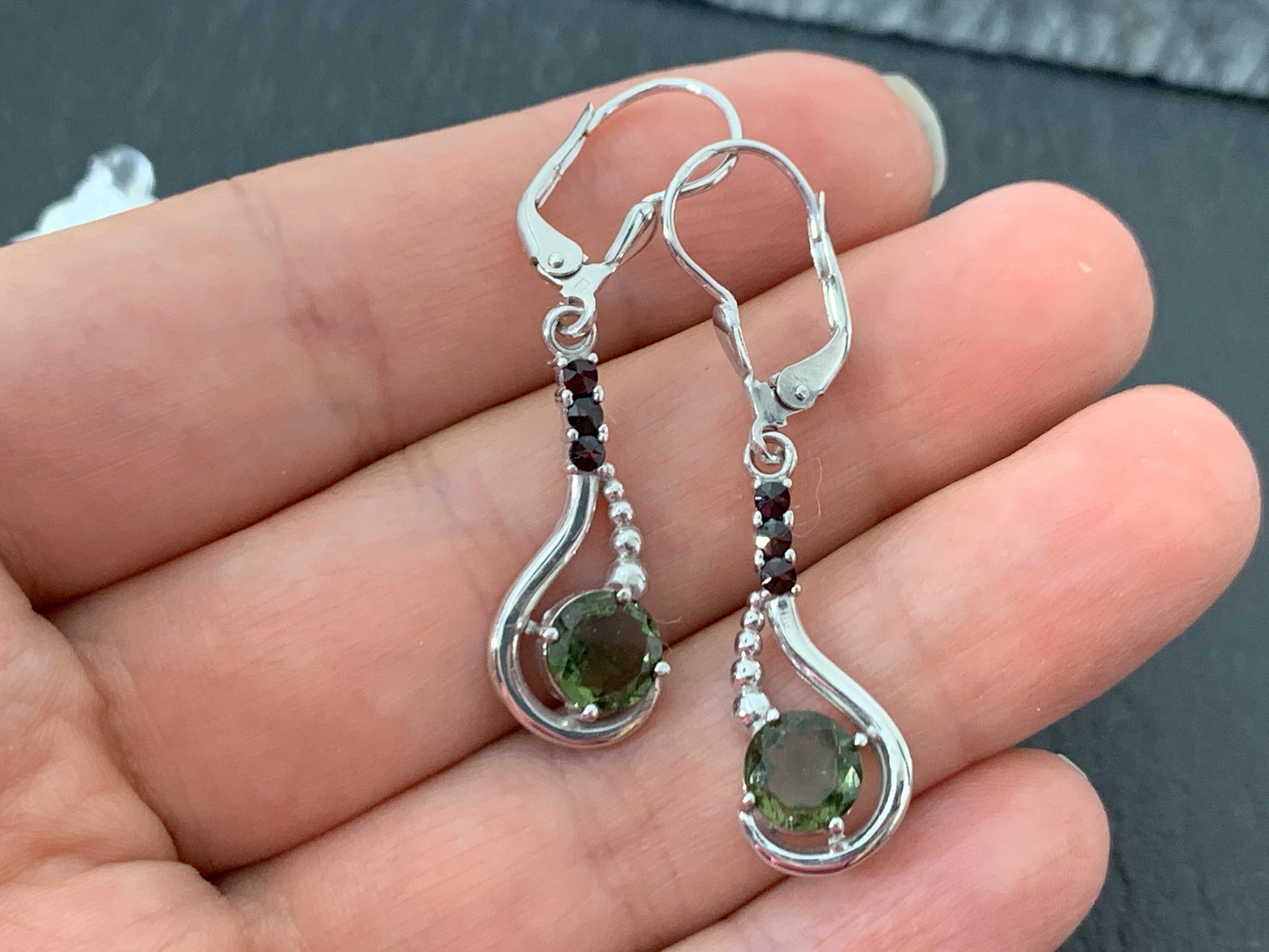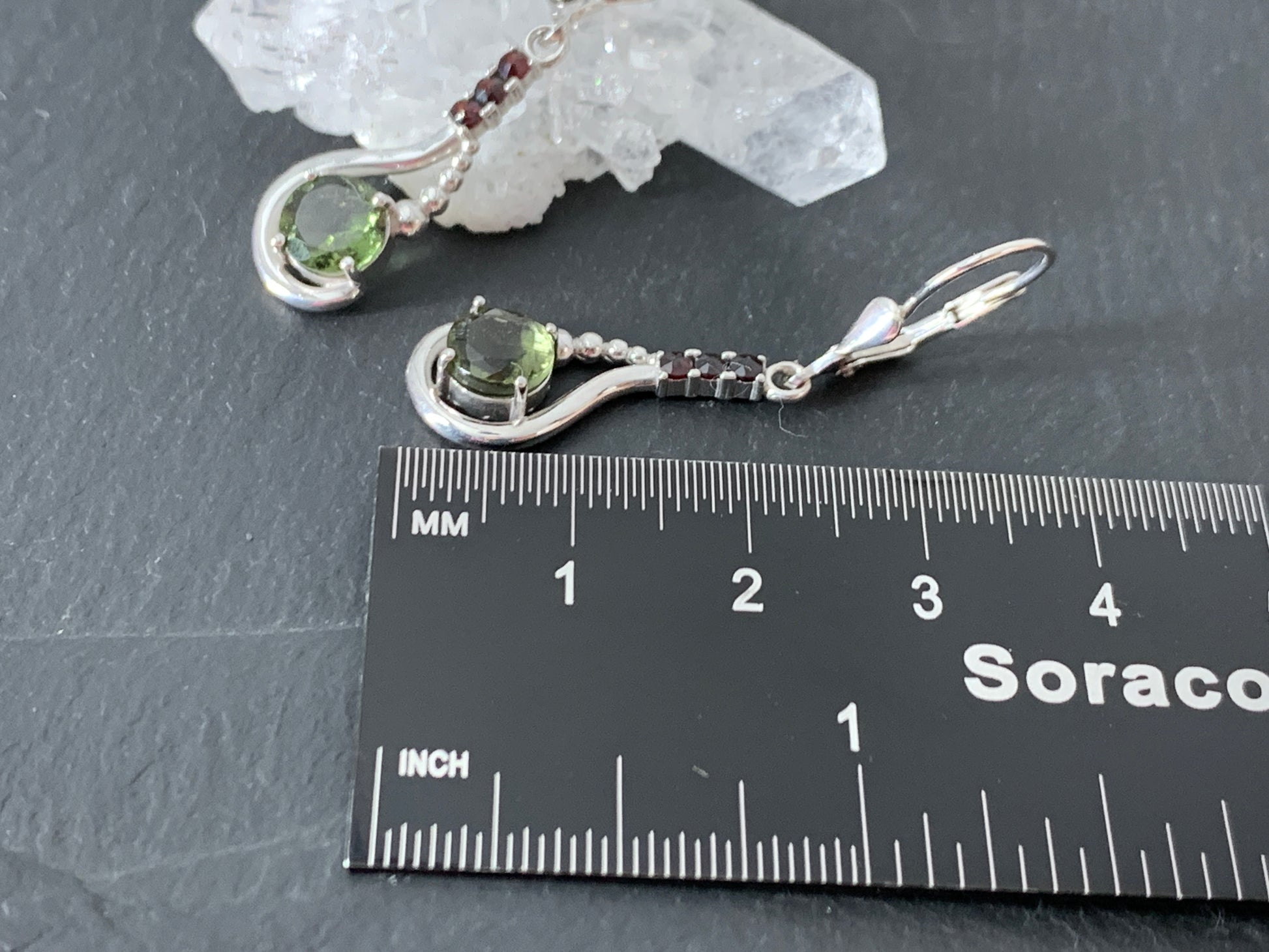 Dimensions: whole earrings are 40mm long/ Moldavite 6mm/ Garnet 1mm