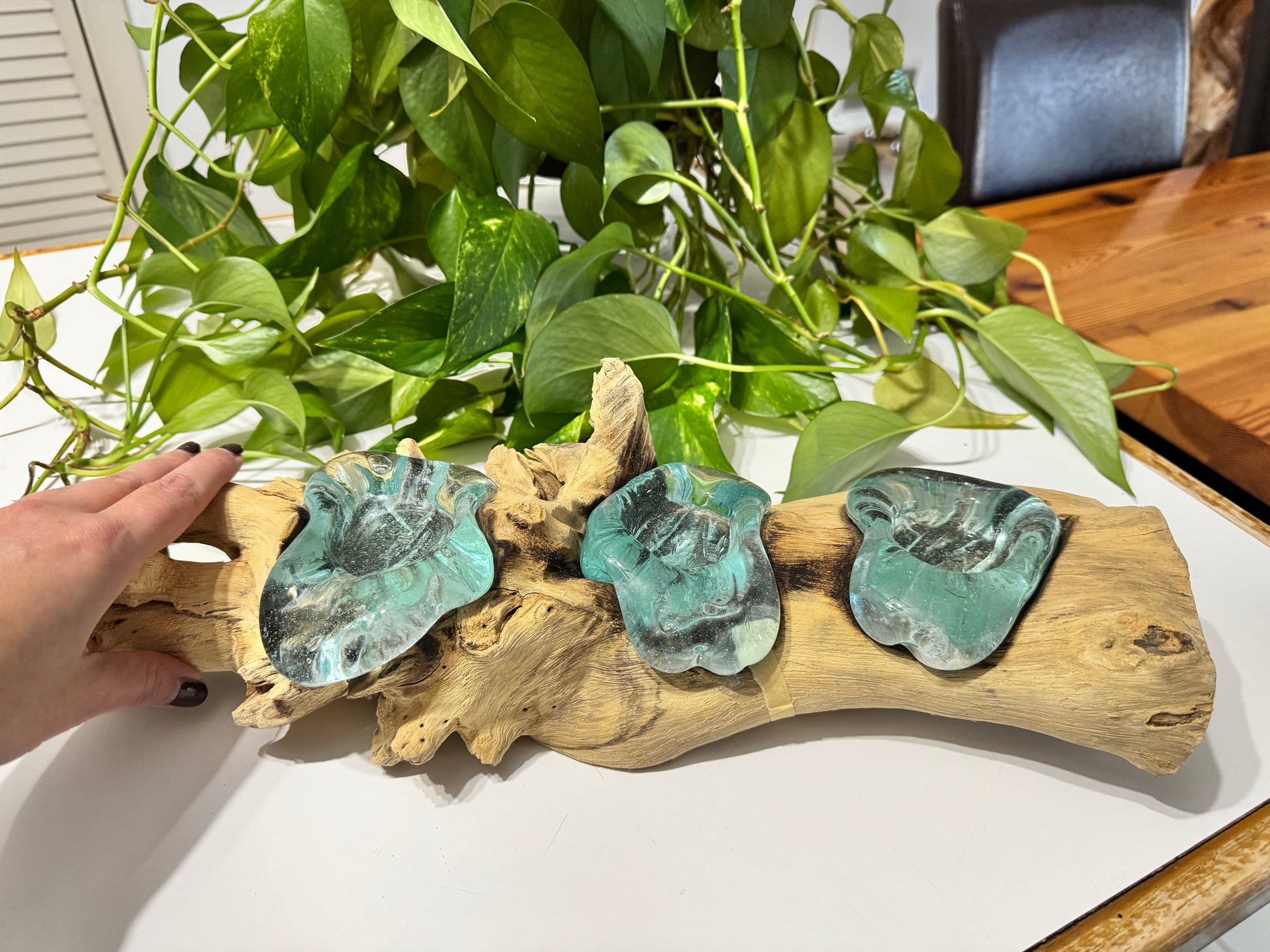 Every piece is one of a kind, shaped by nature and finished by hand, with natural variations in wood grain, texture, and glass flow that make each candle holder truly unique. Perfect as a table centerpiece, shelf accent, or calming decorative piece, it complements coastal, rustic, modern, and nature-inspired interiors.