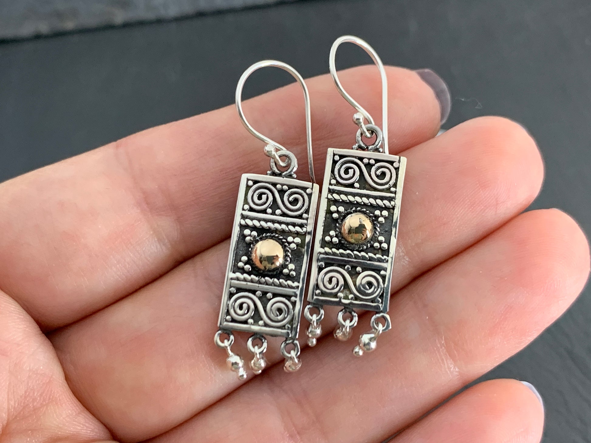 Handcrafted Sterling Silver & 18K Gold Plated Dangle Earrings – Boho Filigree Rectangle Design