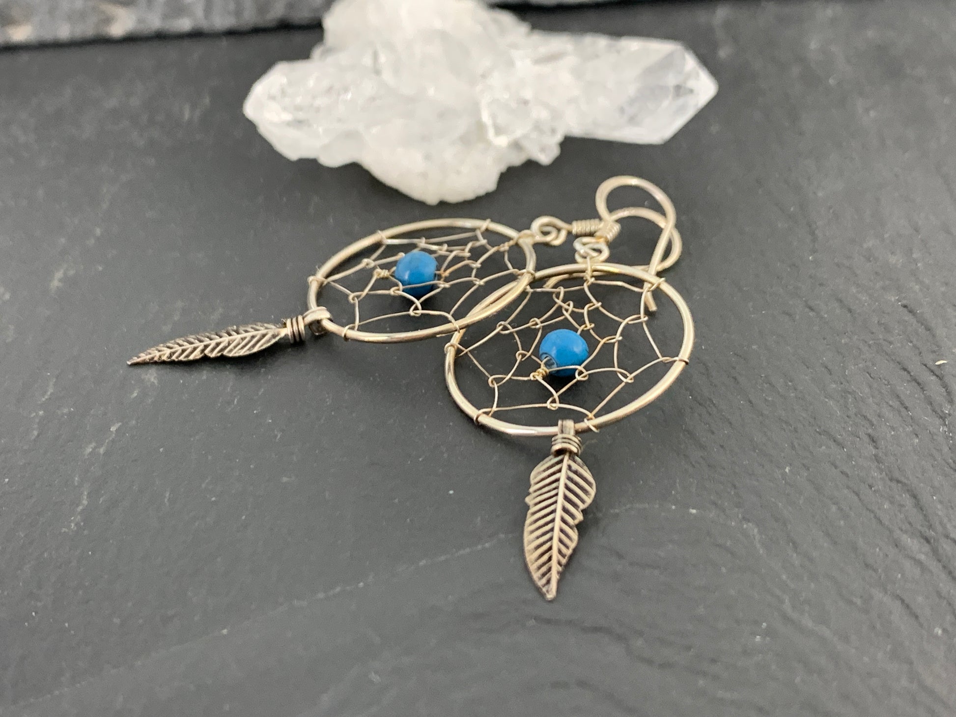 Handmade Dreamcatcher Earrings with Turquoise Bead and Feather Charm – Boho Tribal Style Jewelry
