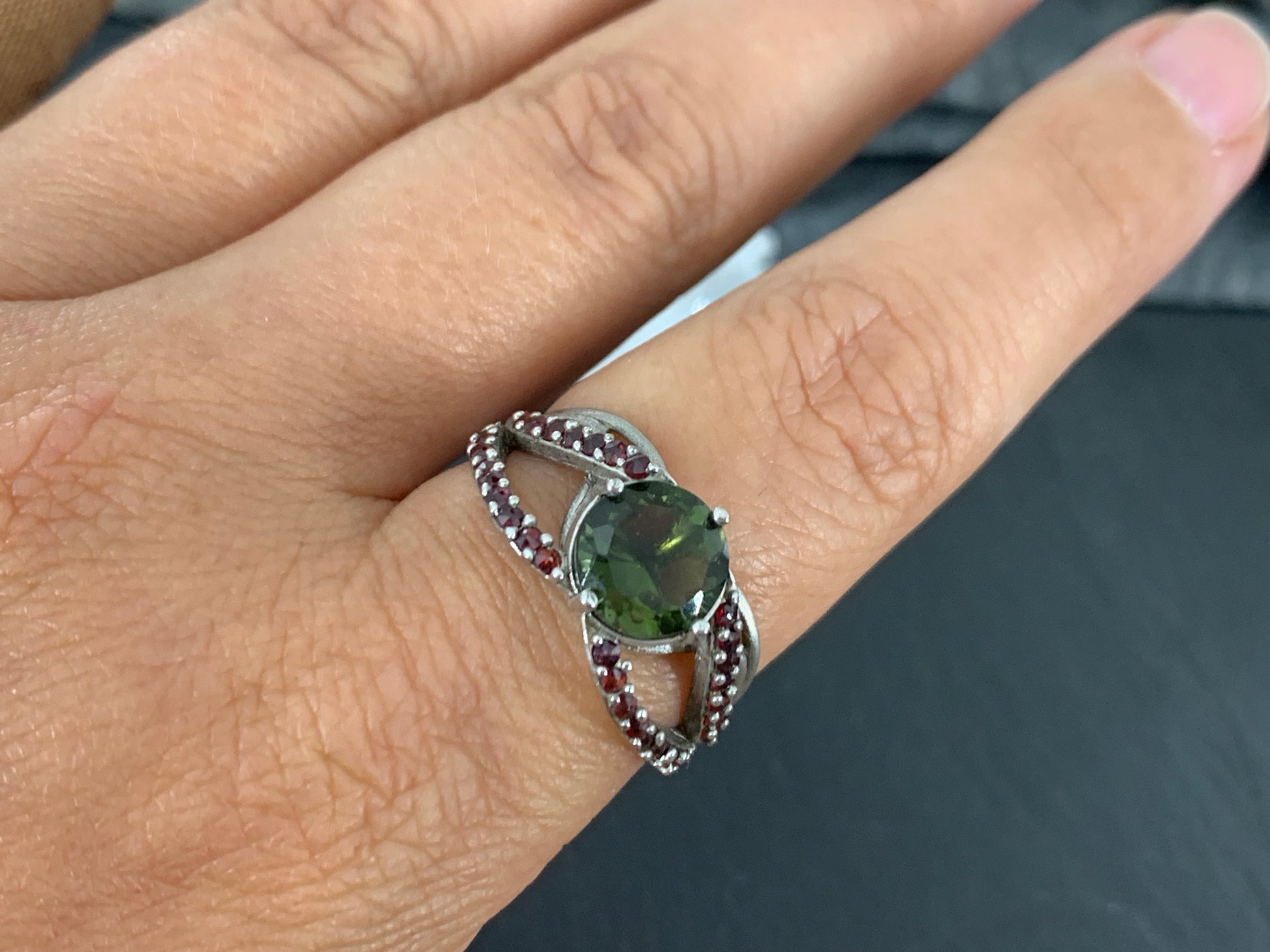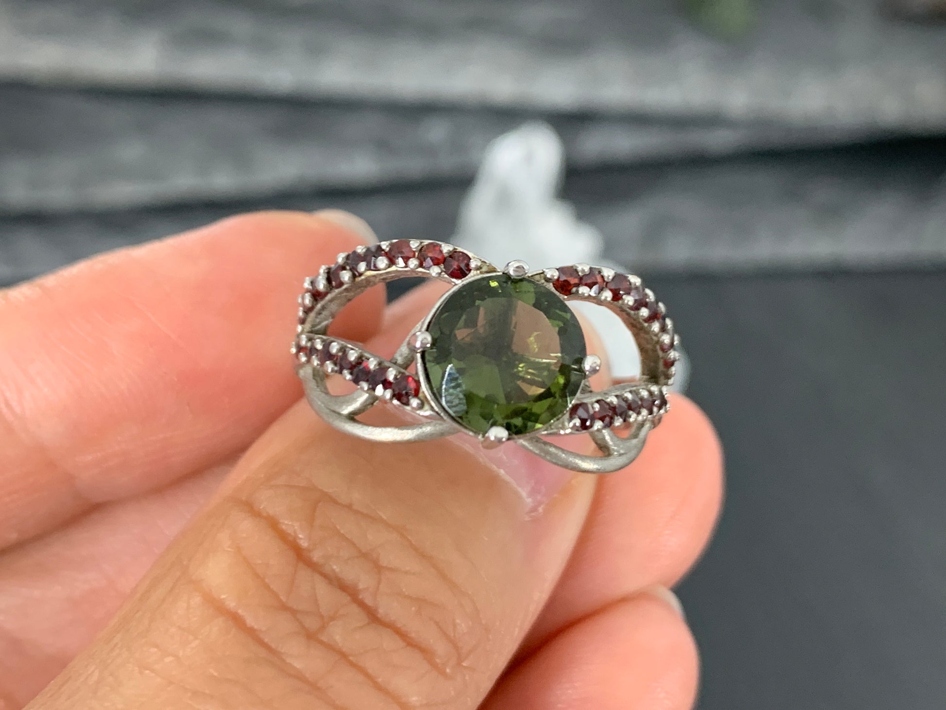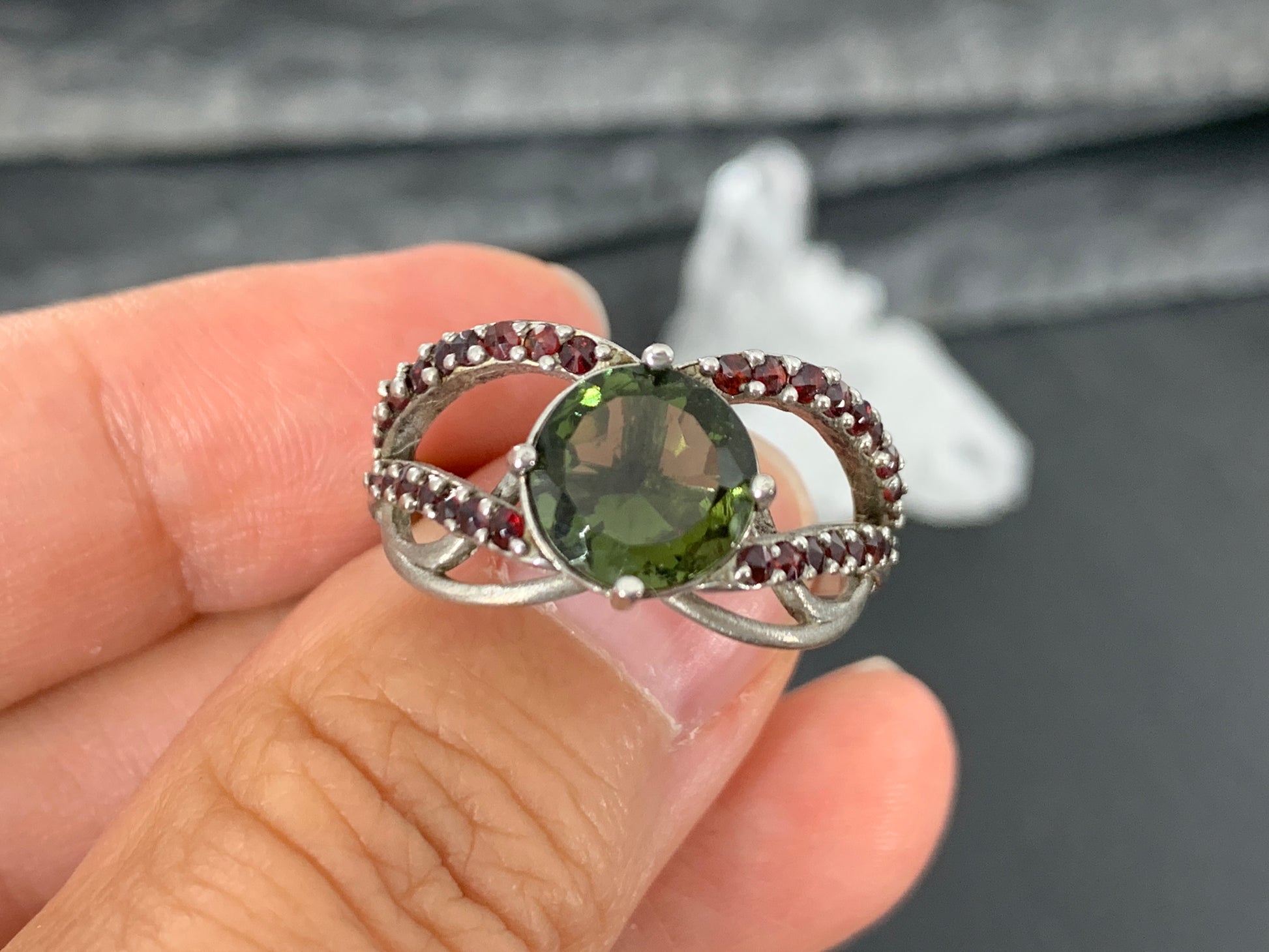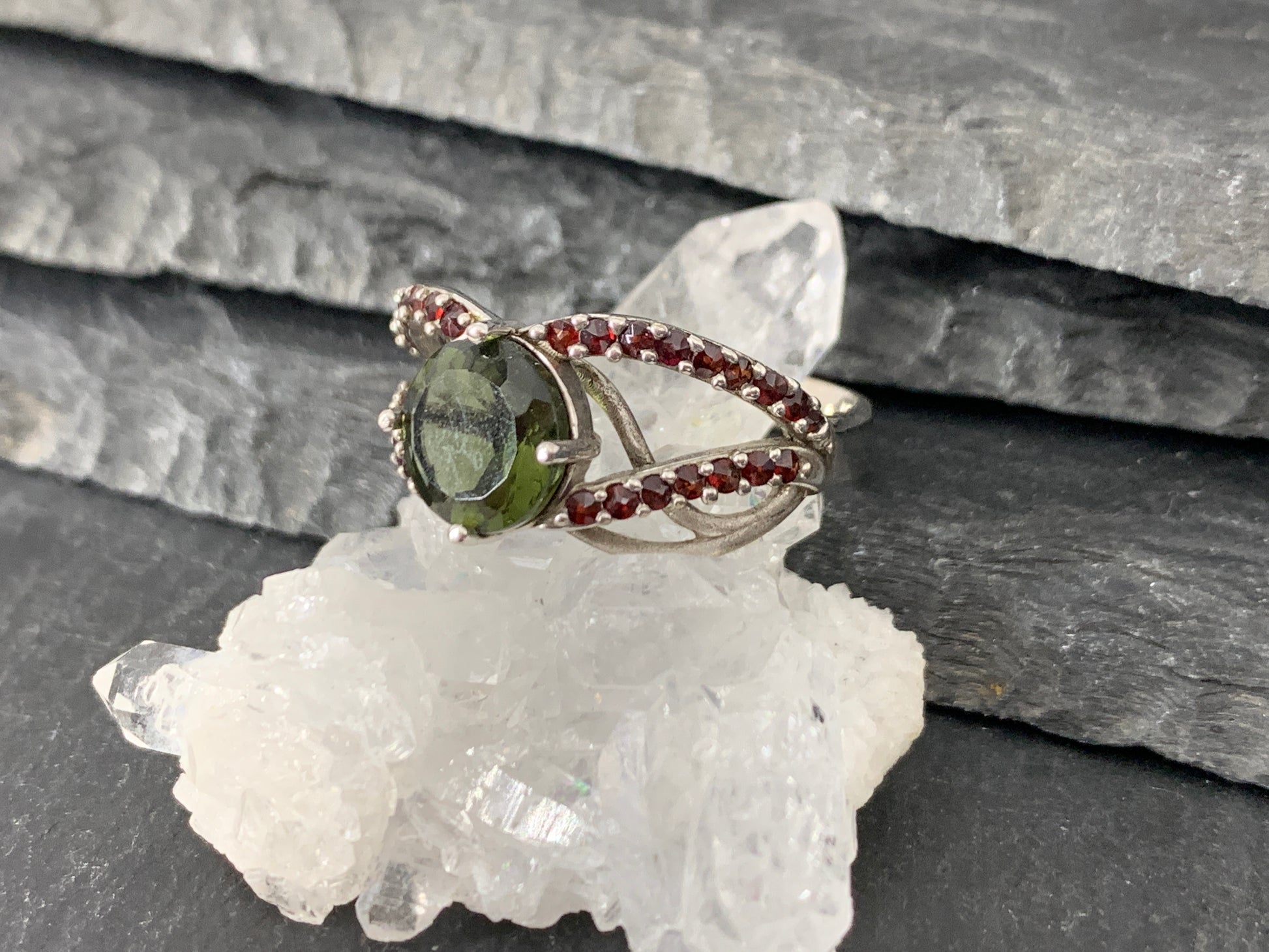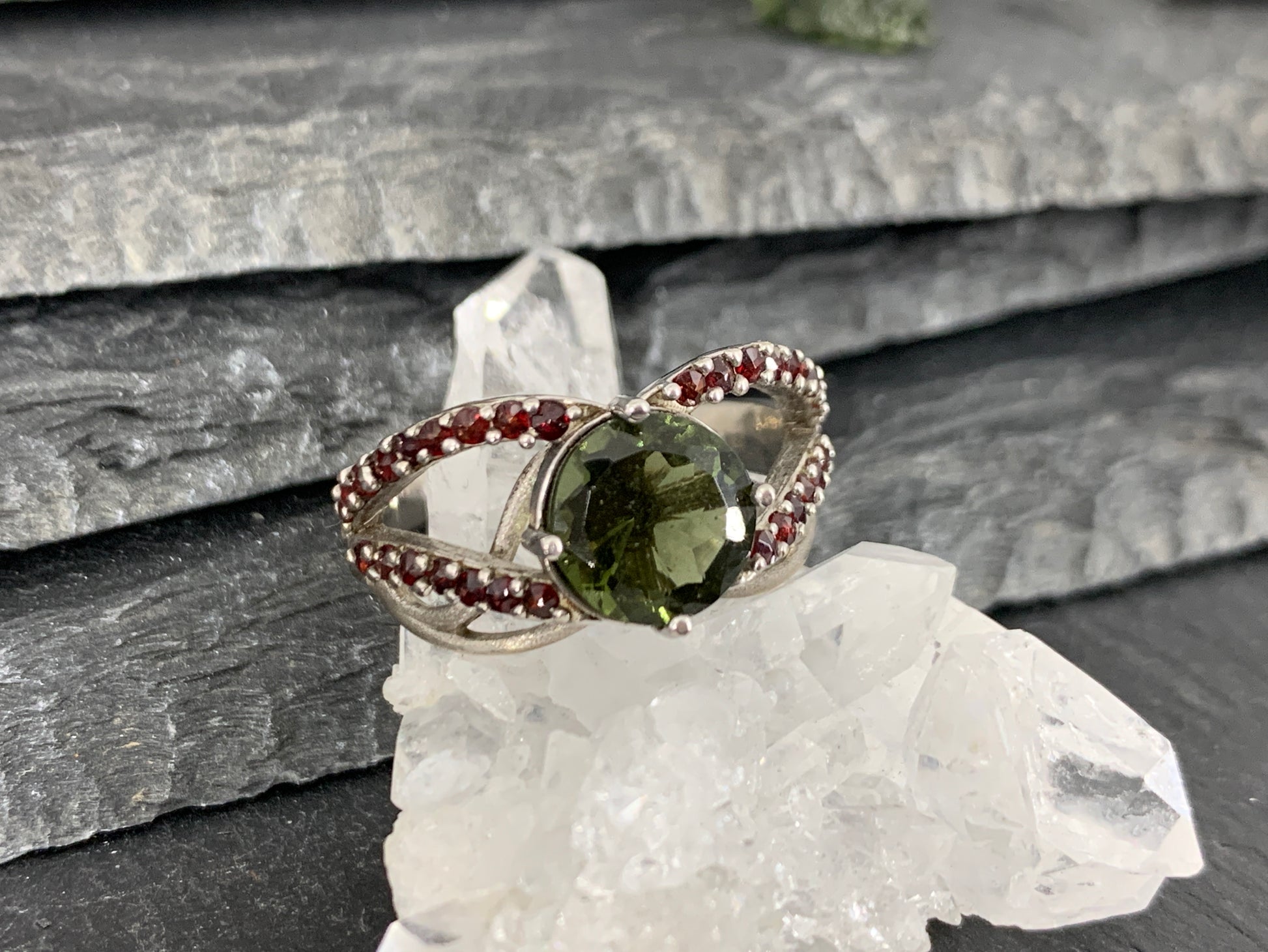 "Mira" Ring- Moldavite & Garnet size 8.75