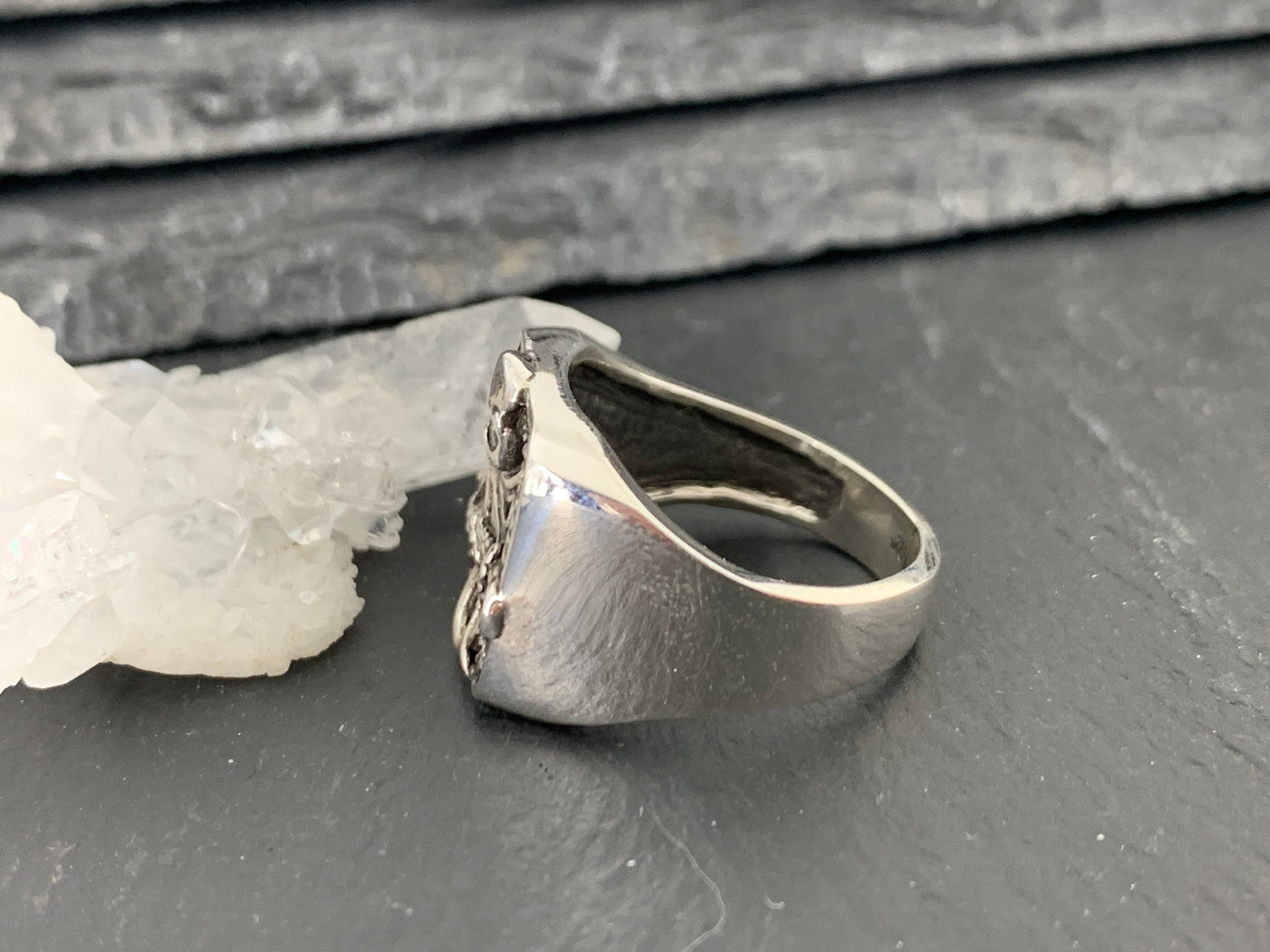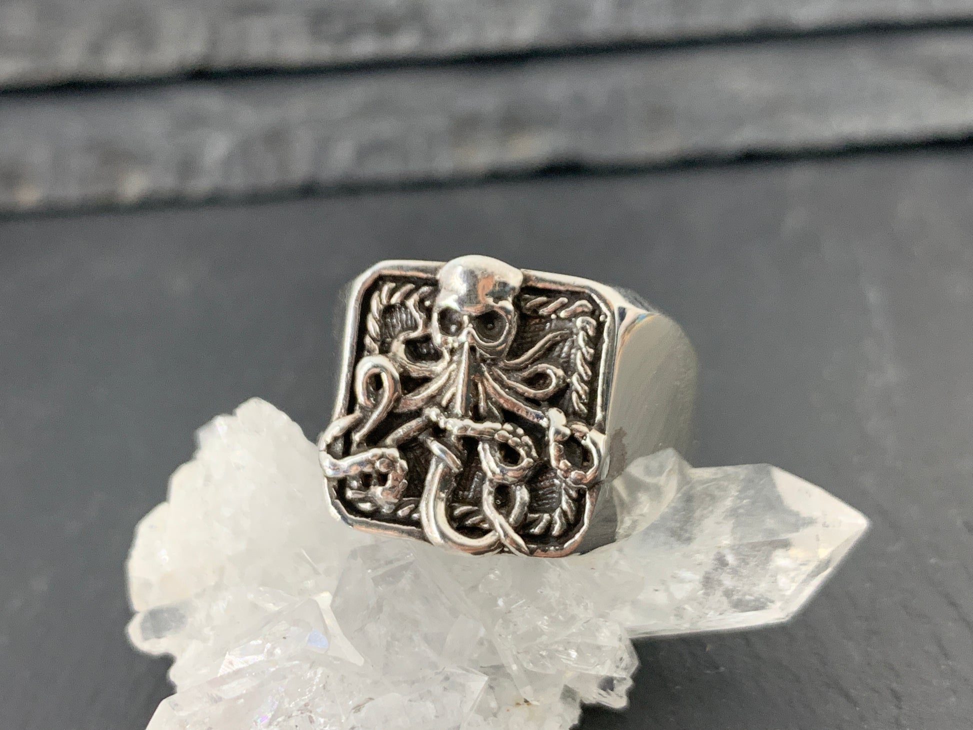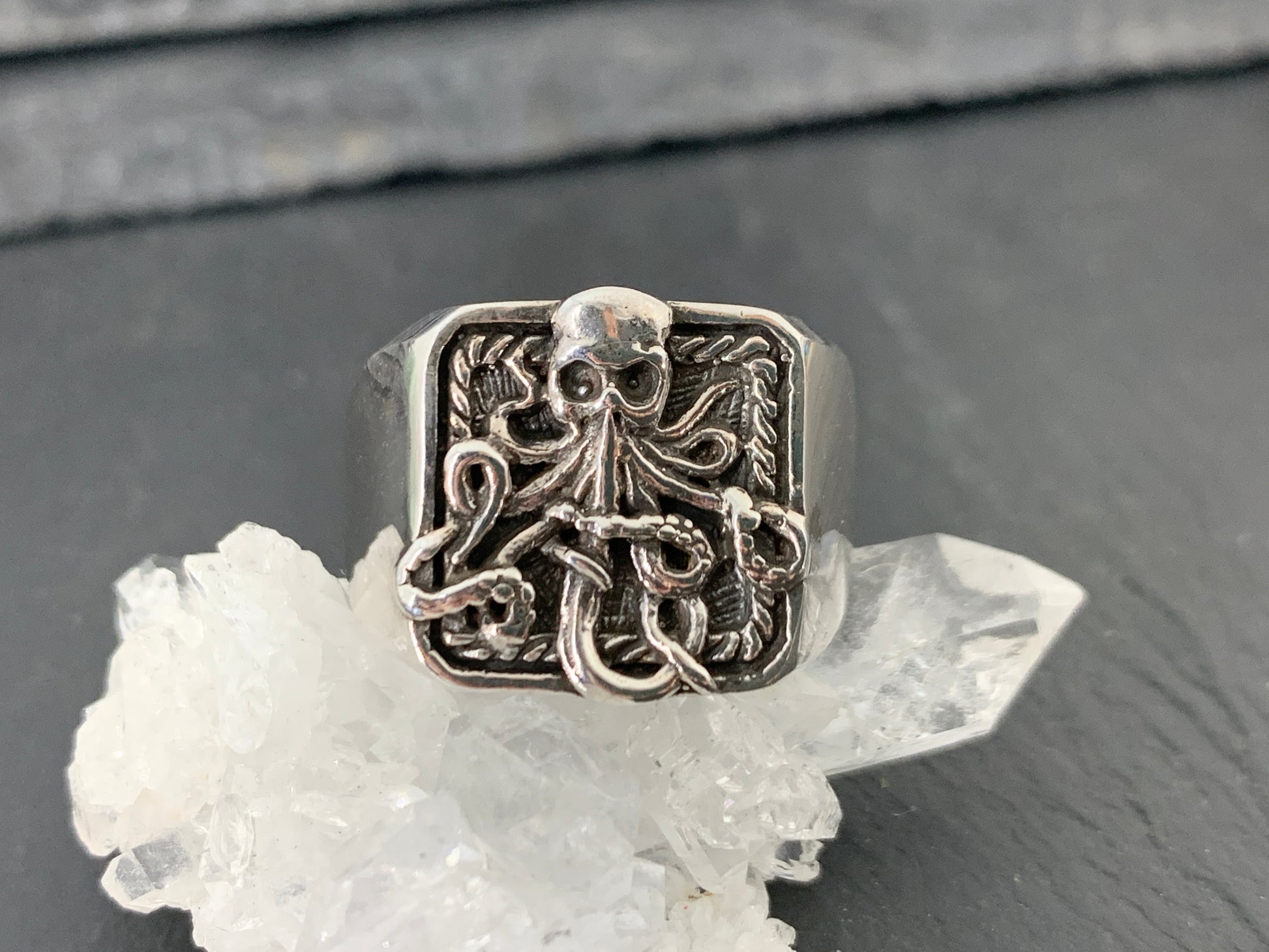 Make a bold statement with this striking octopus signet ring, featuring an intricately carved octopus wrapped in flowing tentacles. The darkened antique-style detailing creates dramatic depth, giving the ring a rugged, powerful look inspired by nautical legends and mythical sea creatures.