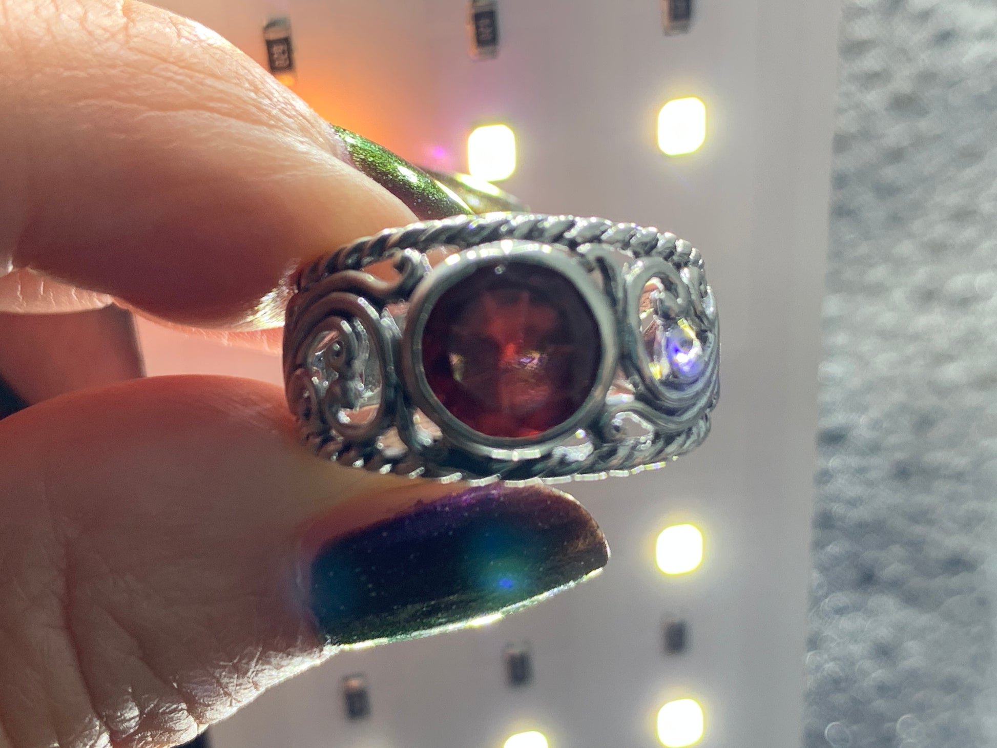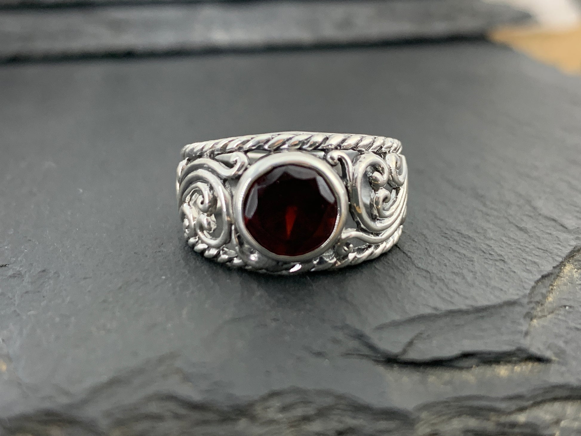 Elevate your style with this intricately crafted sterling silver ring, featuring a rich, deep-red garnet at its center. The round bezel-set gemstone is framed by an ornate filigree design, enhanced with delicate silver beadwork for a vintage-inspired look. Perfect for those who appreciate bohemian elegance or timeless artisan jewelry, this ring brings a touch of sophistication to any outfit. Handcrafted with care, it makes a meaningful gift or a striking personal statement piece.