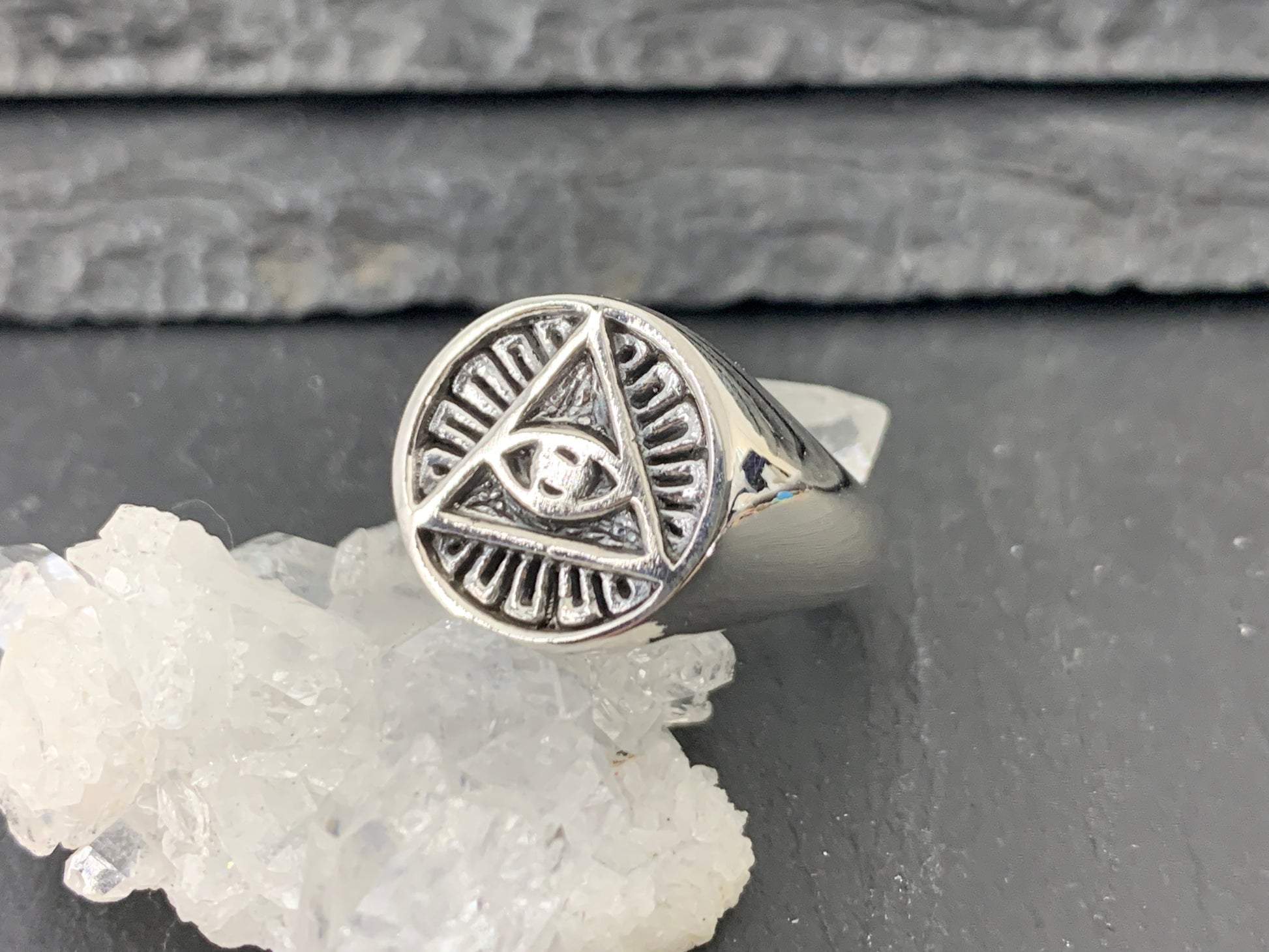 This handcrafted silver ring features a bold triangle symbol with an eye-inspired design, giving it a mysterious, esoteric look. The engraved detailing creates a classic signet-style finish, perfect for anyone who loves mystical, occult, or symbolic jewelry.