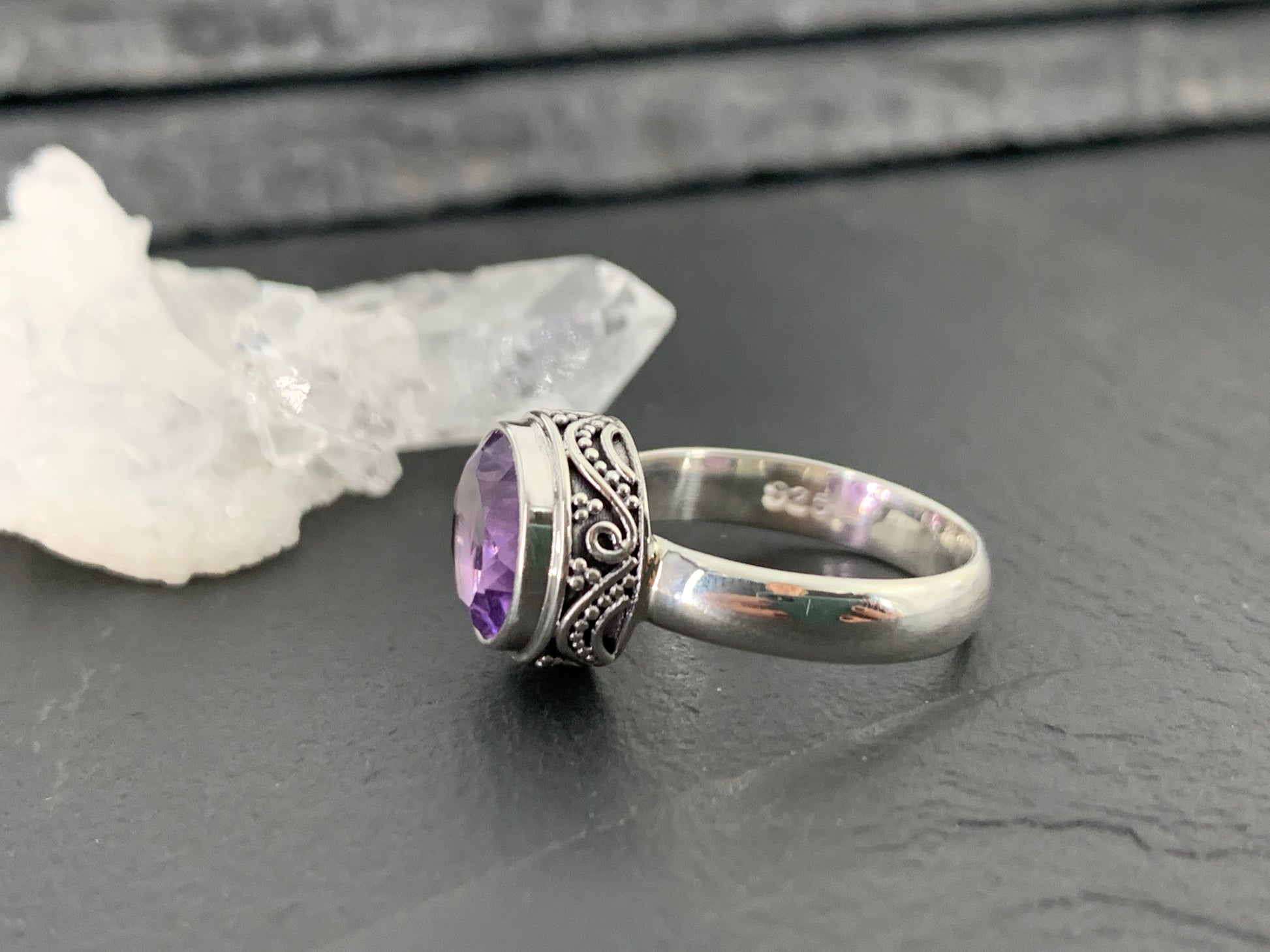 This stunning handcrafted ring features a brilliant oval-cut amethyst set in a detailed sterling silver band with vintage-inspired filigree accents. The deep purple of the amethyst gemstone is rich and vibrant, making it a perfect statement piece or a meaningful February birthstone gift.