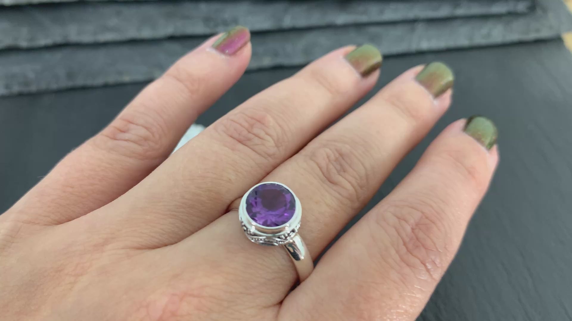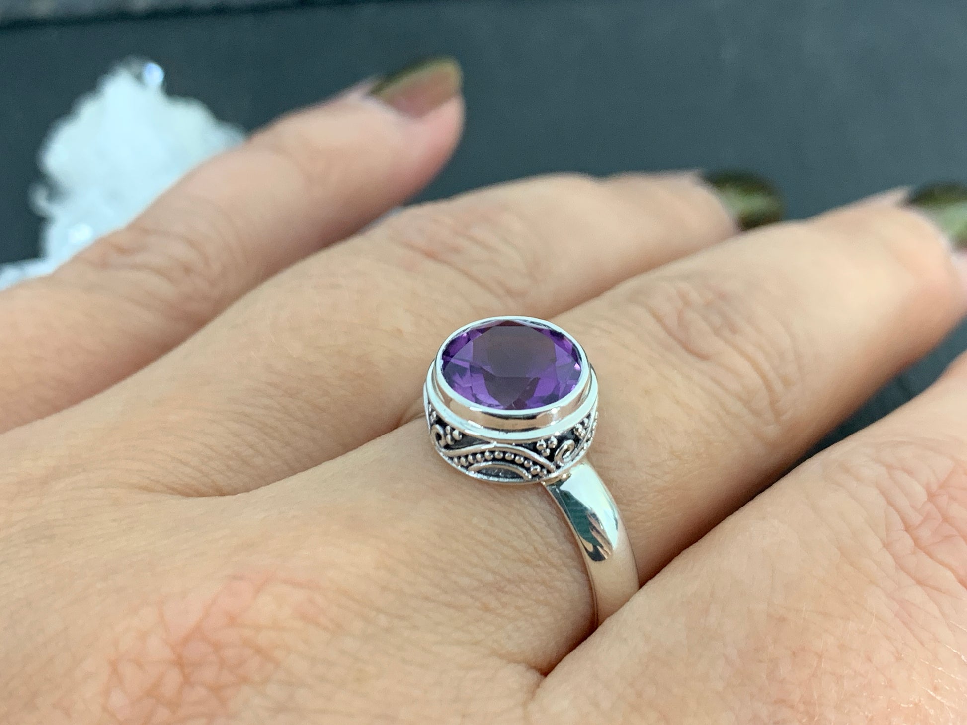 Sterling Silver Amethyst Ring – Vintage Style Round Cut Gemstone Ring – February Birthstone