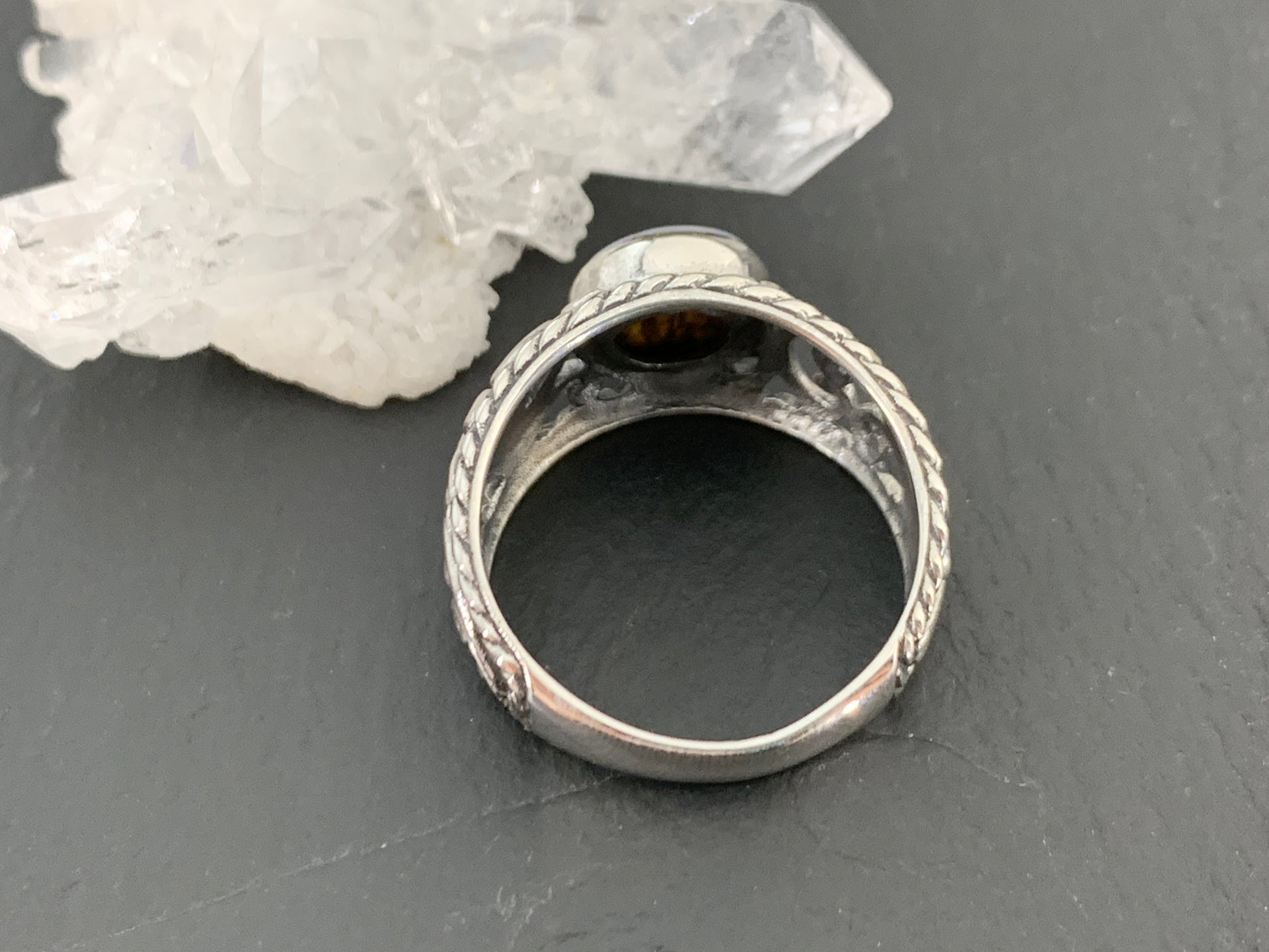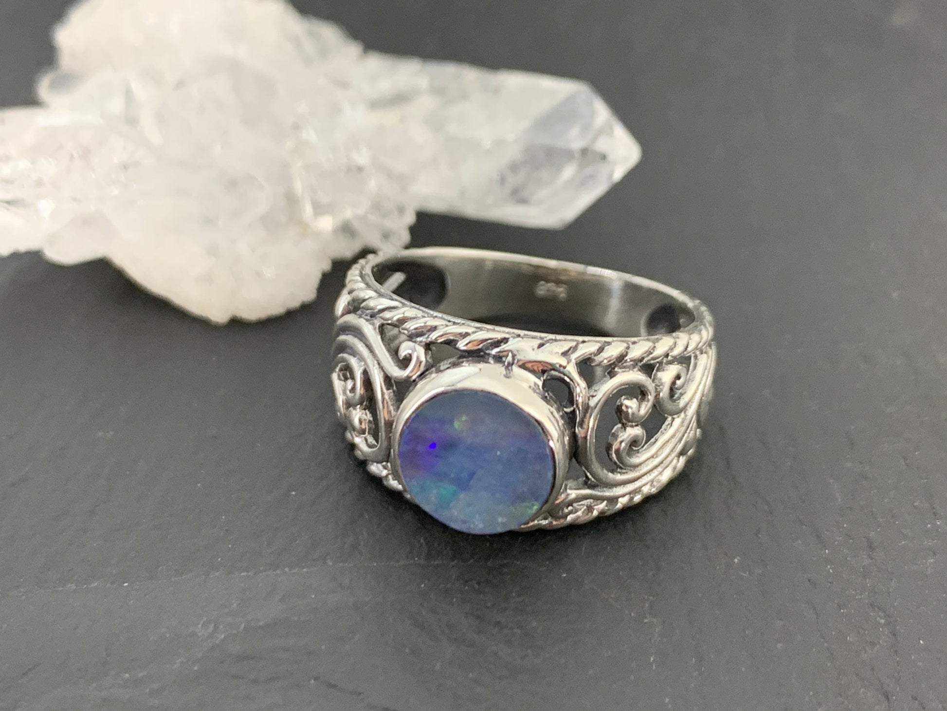 Handcrafted sterling silver ring features teardrop blue opal at its center, radiating hues of blues, red, yellow, green and purples.