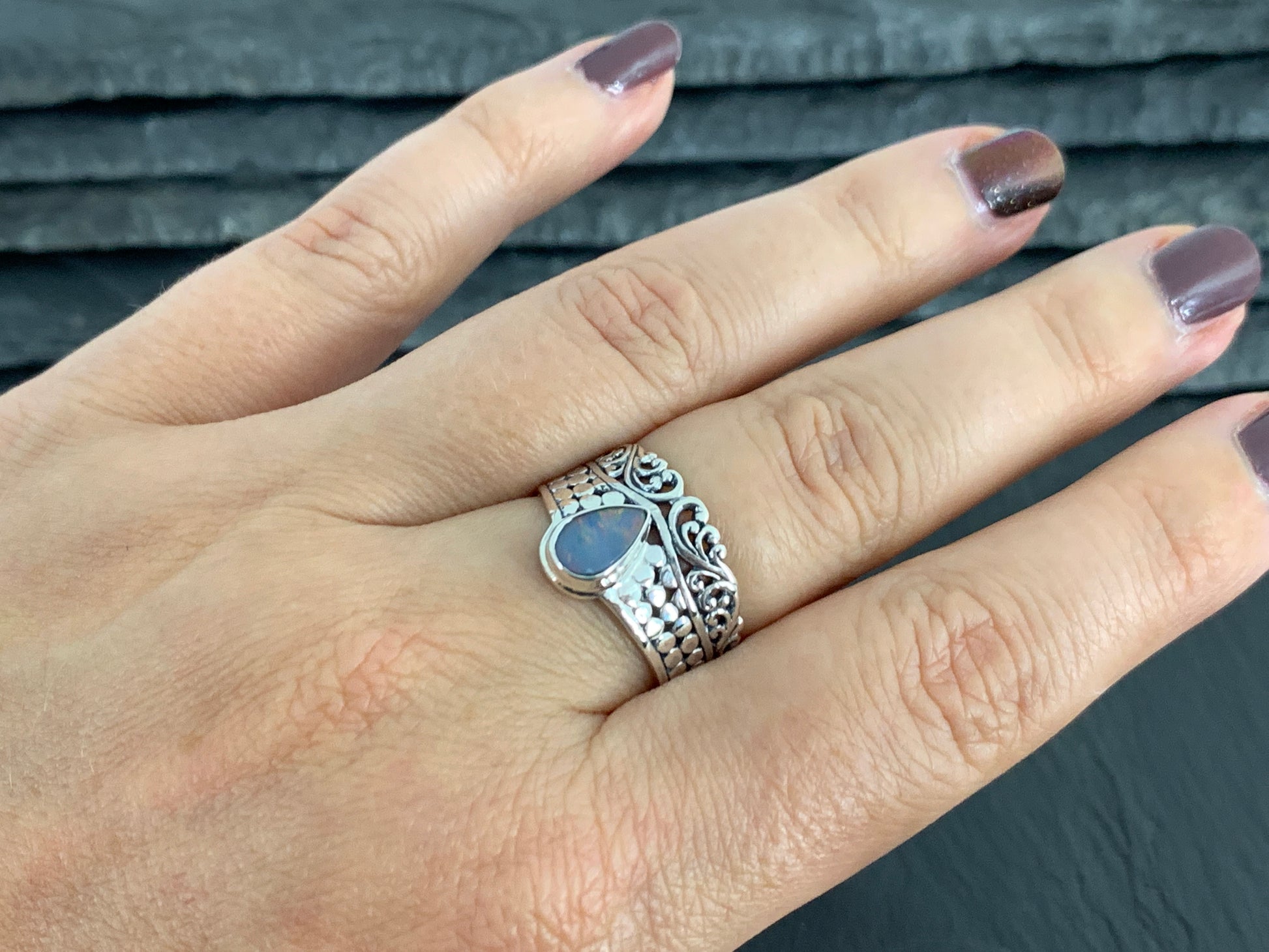 Sterling Silver Australian Opal Ring - Wide Band Statement Ring - size 8 US