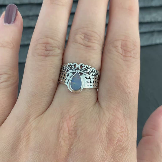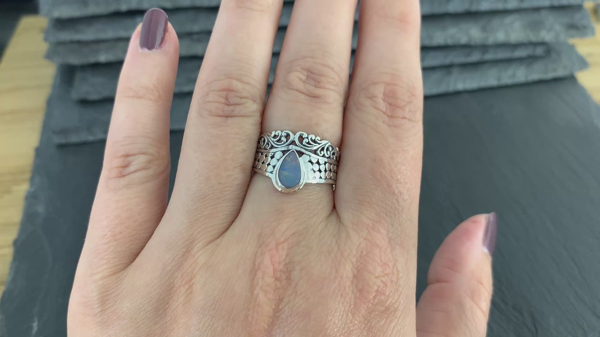 Handcrafted sterling silver ring features teardrop blue opal at its center, radiating hues of blues, red, yellow, green and purples.