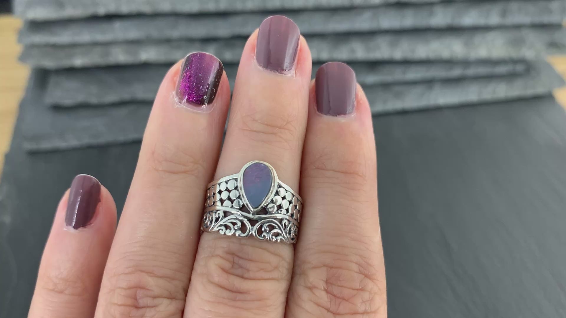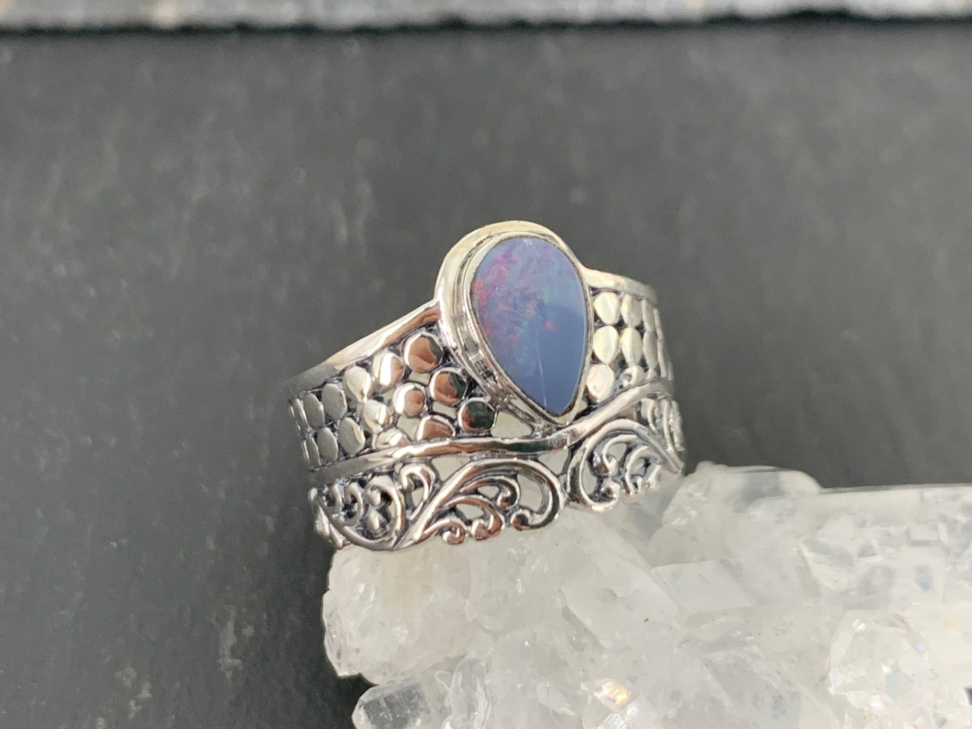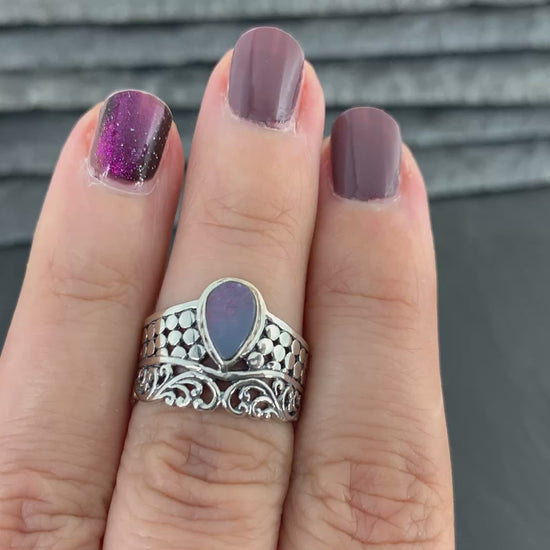 Handcrafted sterling silver ring features teardrop blue opal at its center, radiating hues of blues, red, yellow, green and purples.