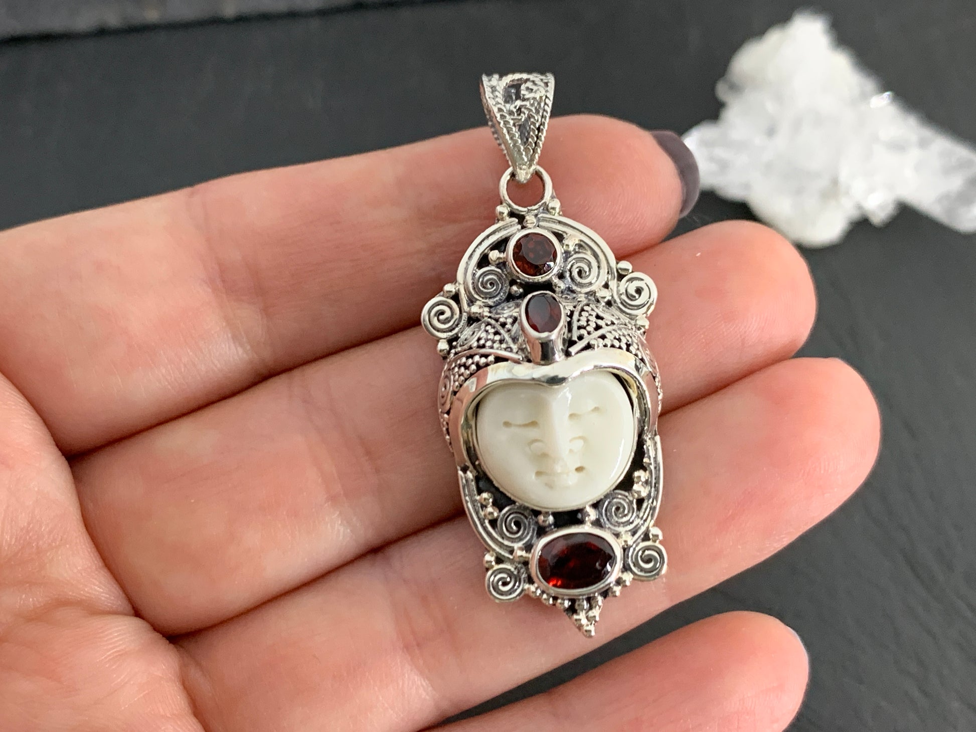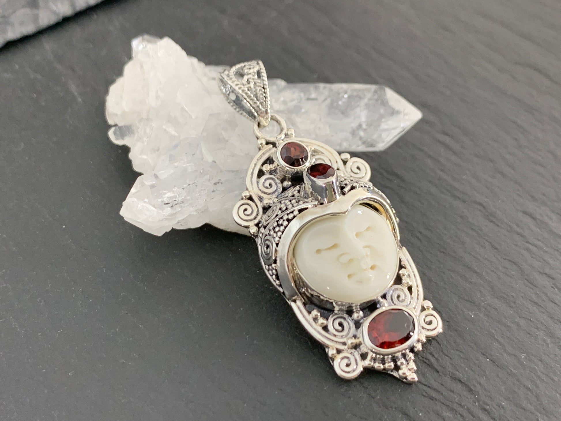 Sterling Silver Face Pendant • Hand-Carved Bone Moon Goddess Jewelry • Gemstone Pendant with Garnet
