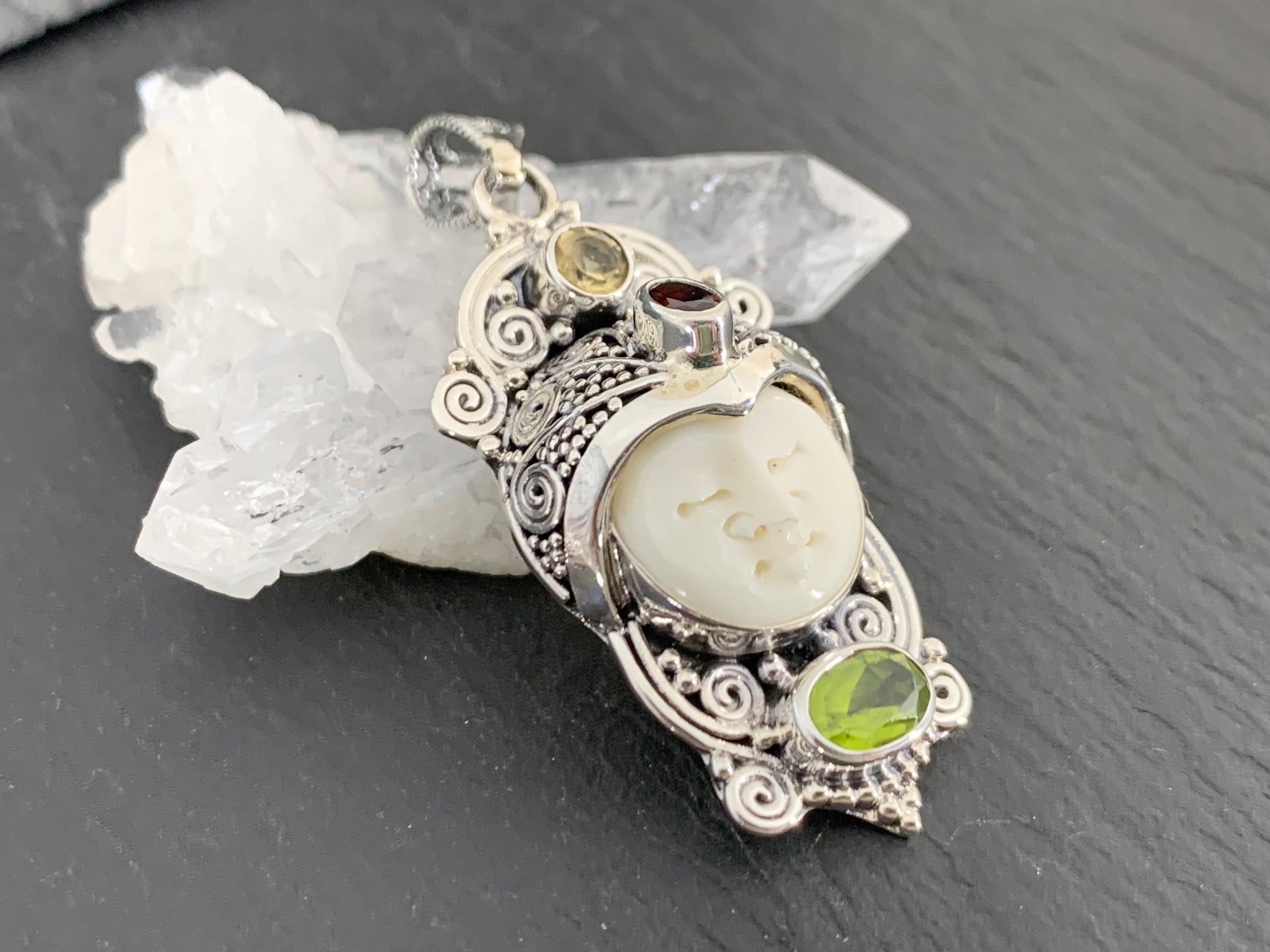 Sterling Silver Face Pendant • Hand-Carved Bone Moon Goddess Jewelry • Gemstone Pendant with Garnet, Citrine & Peridot