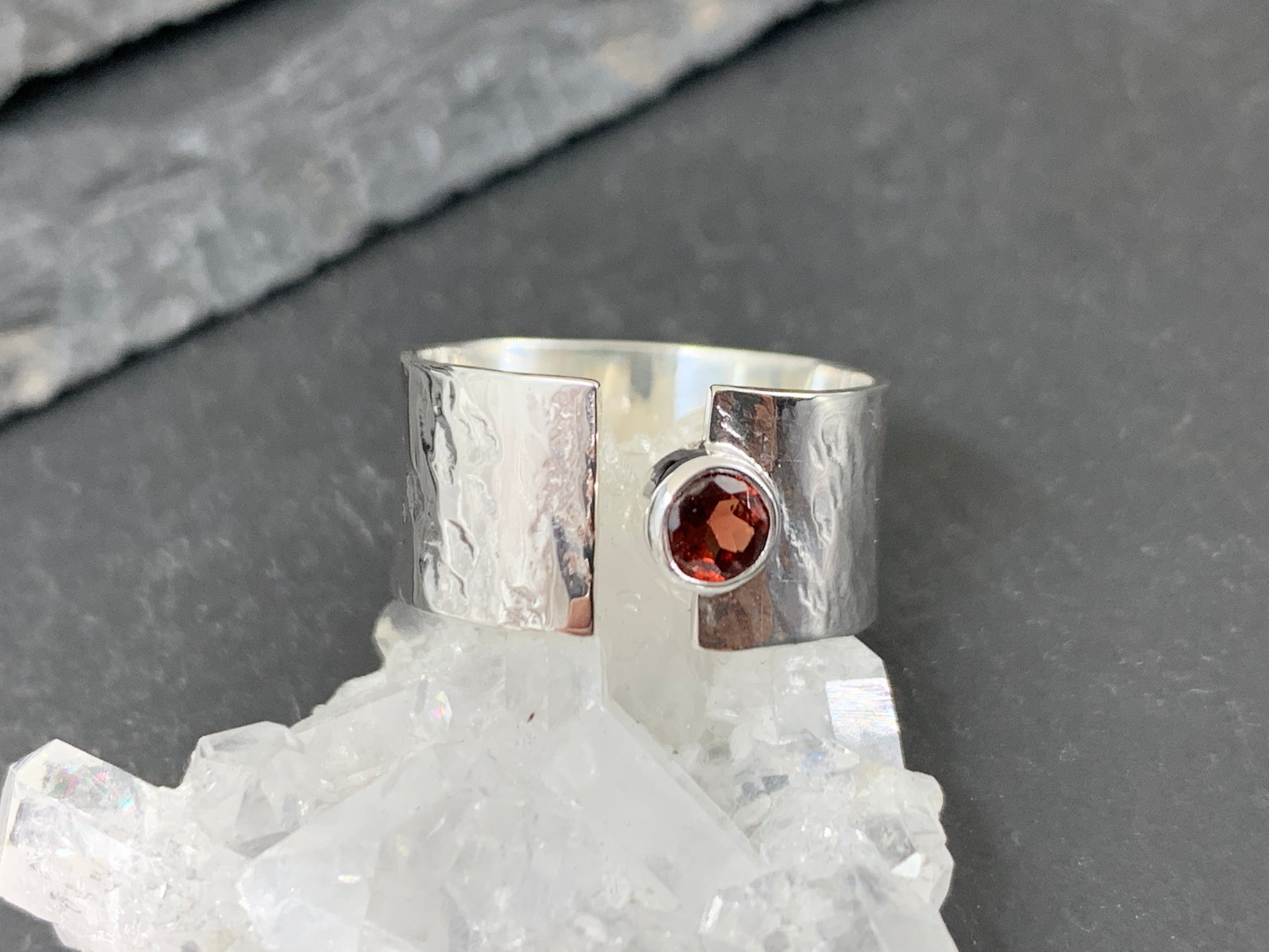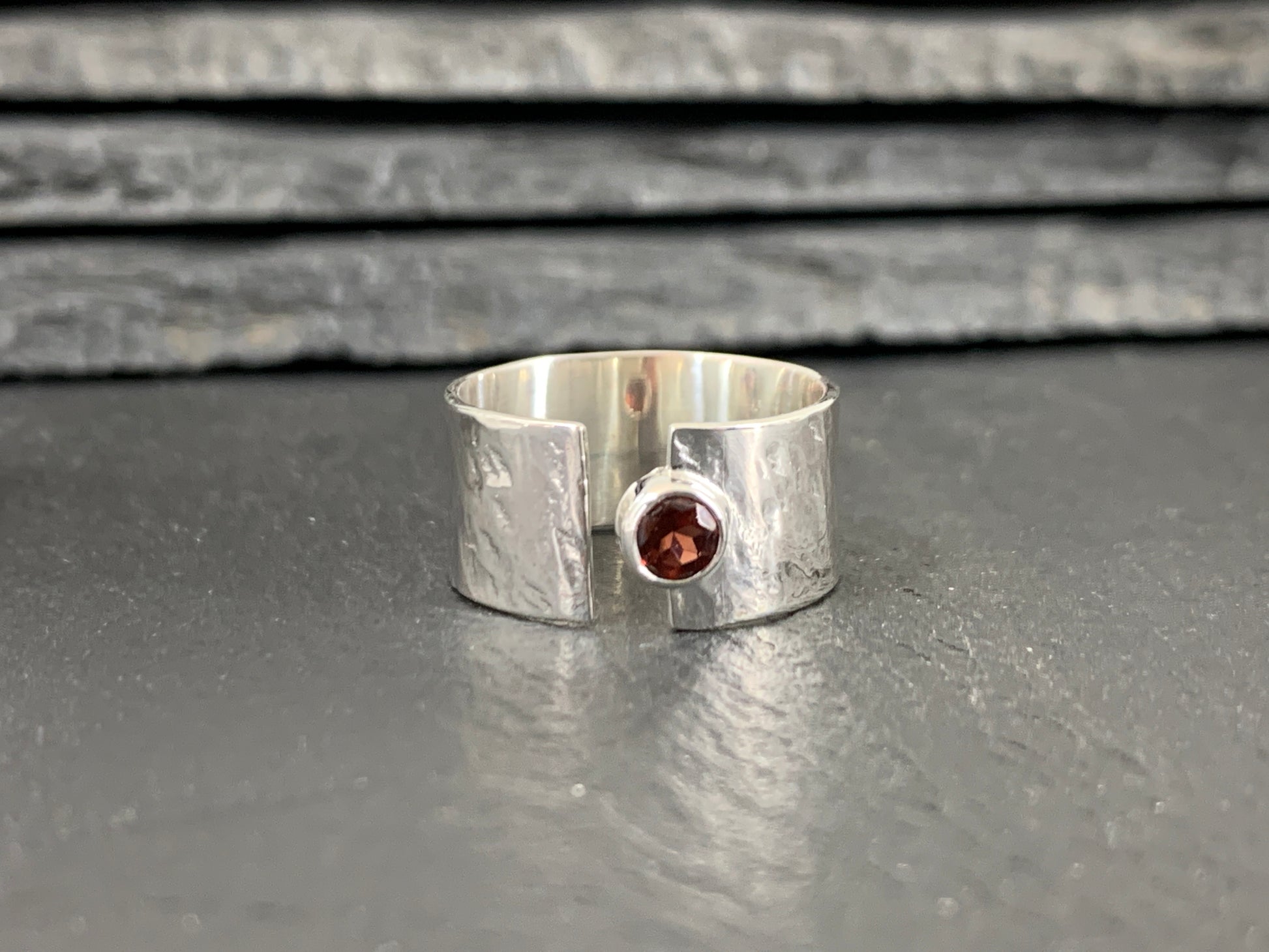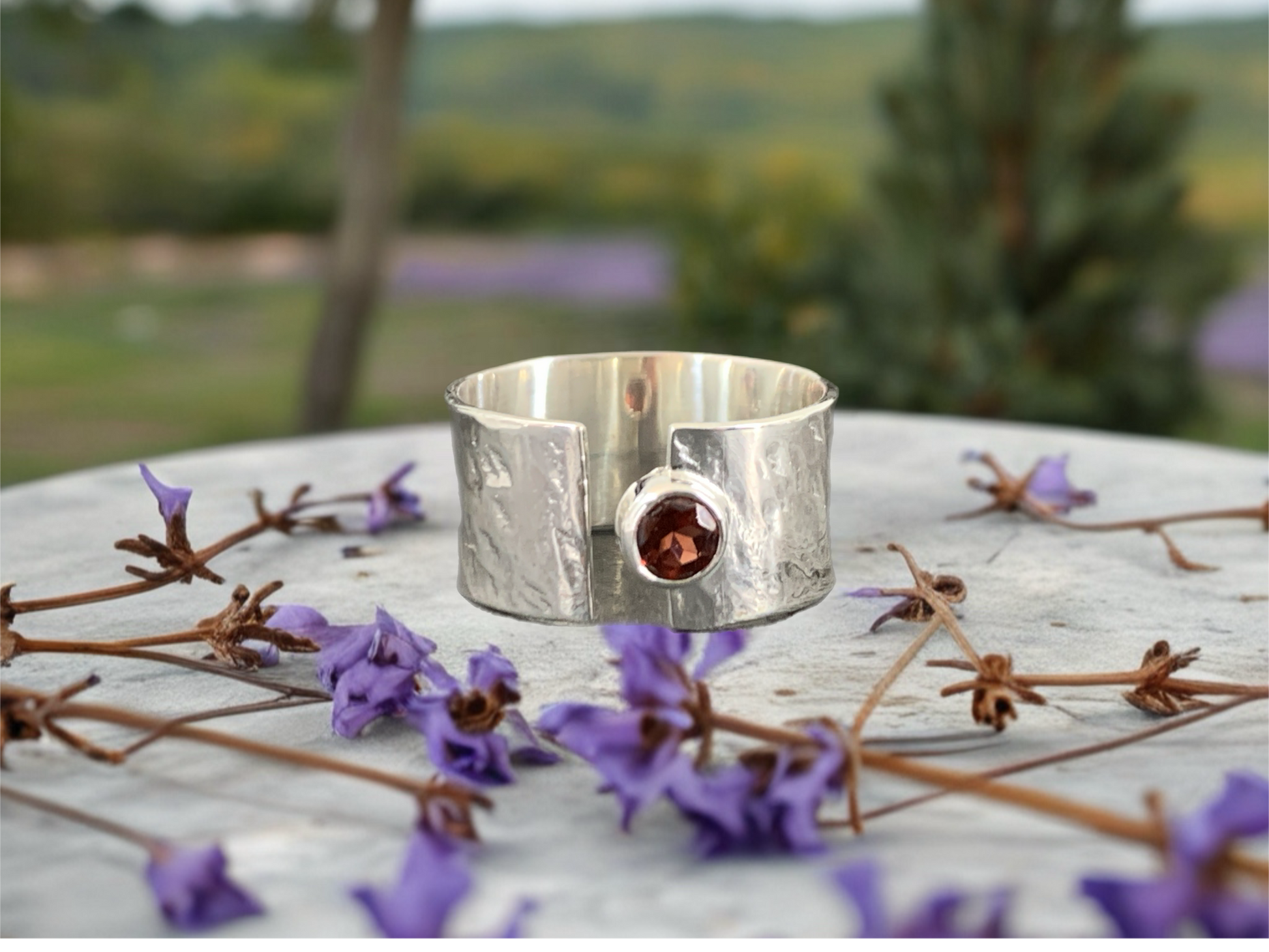 Sterling Silver Garnet Ring - Wide Band Statement Ring - size 7.25US