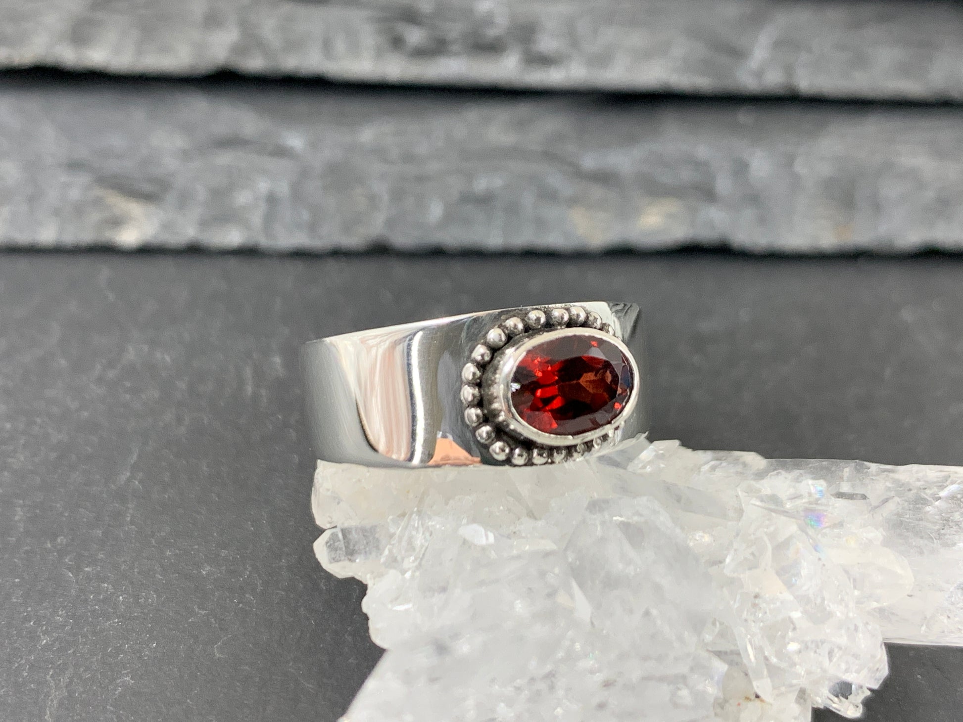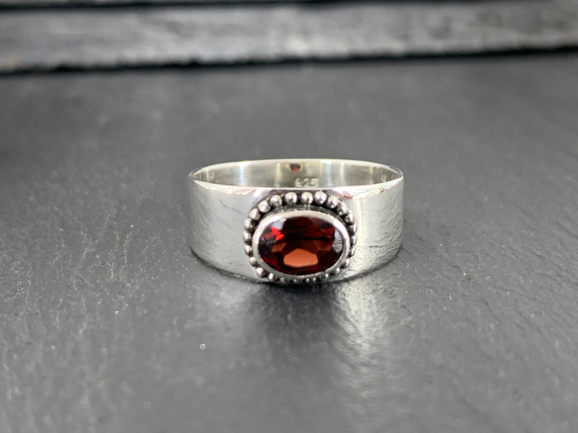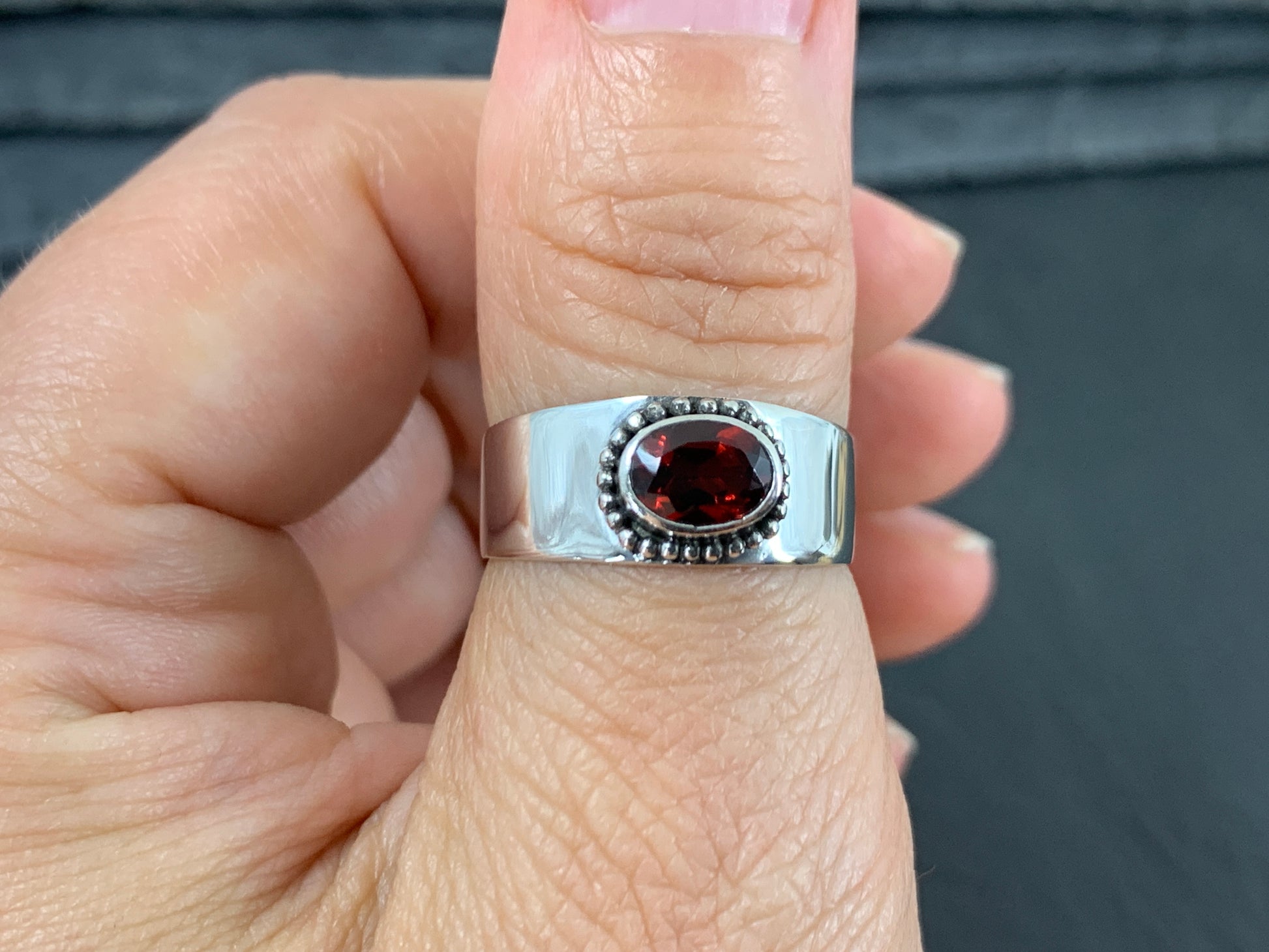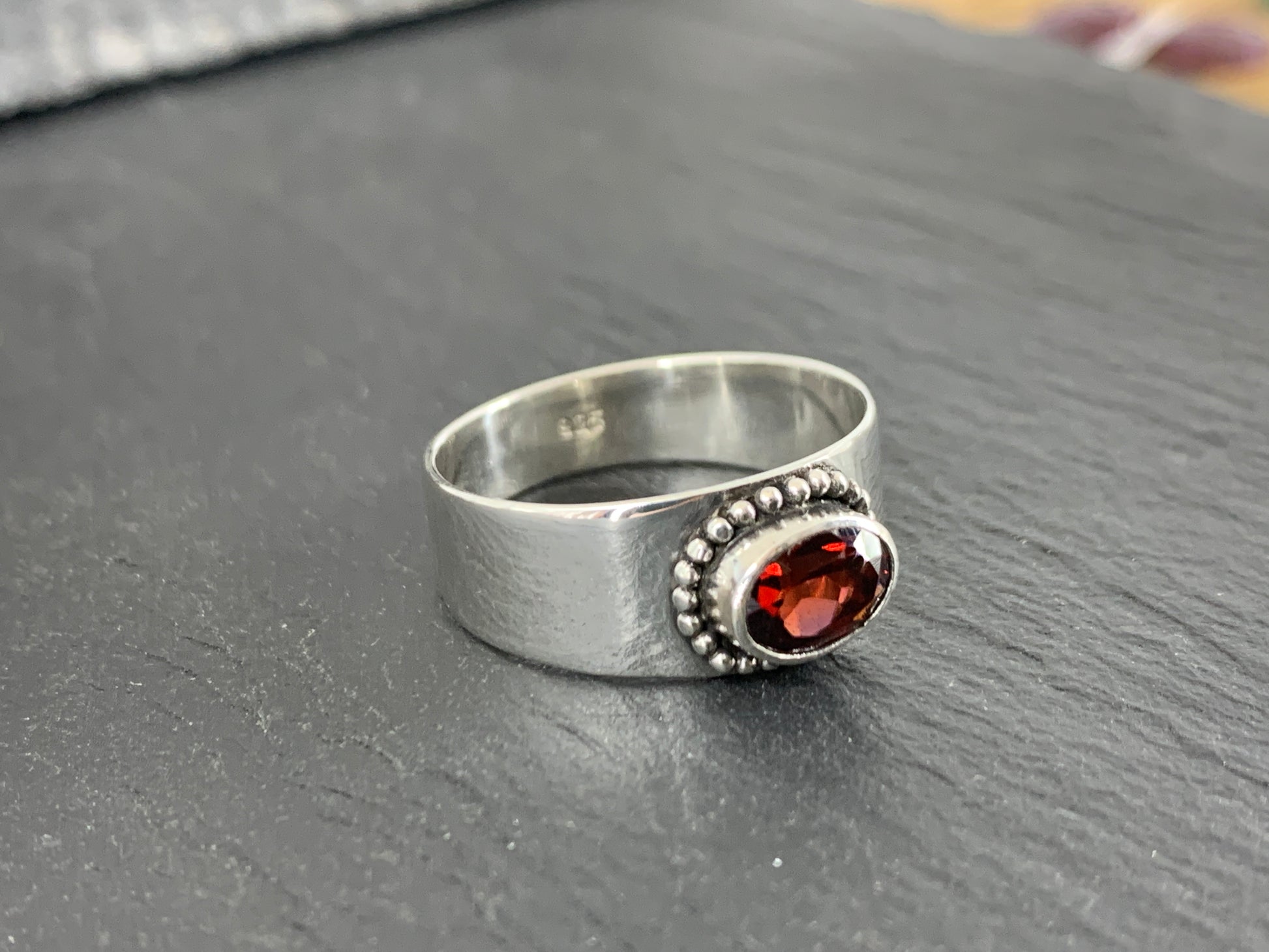 Sterling Silver Garnet Ring - Wide Band Statement Ring - size 8US