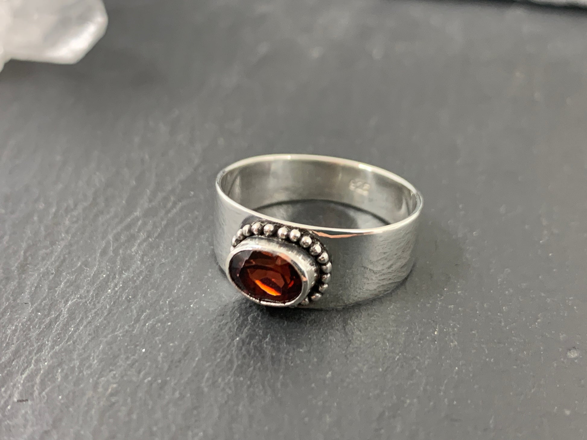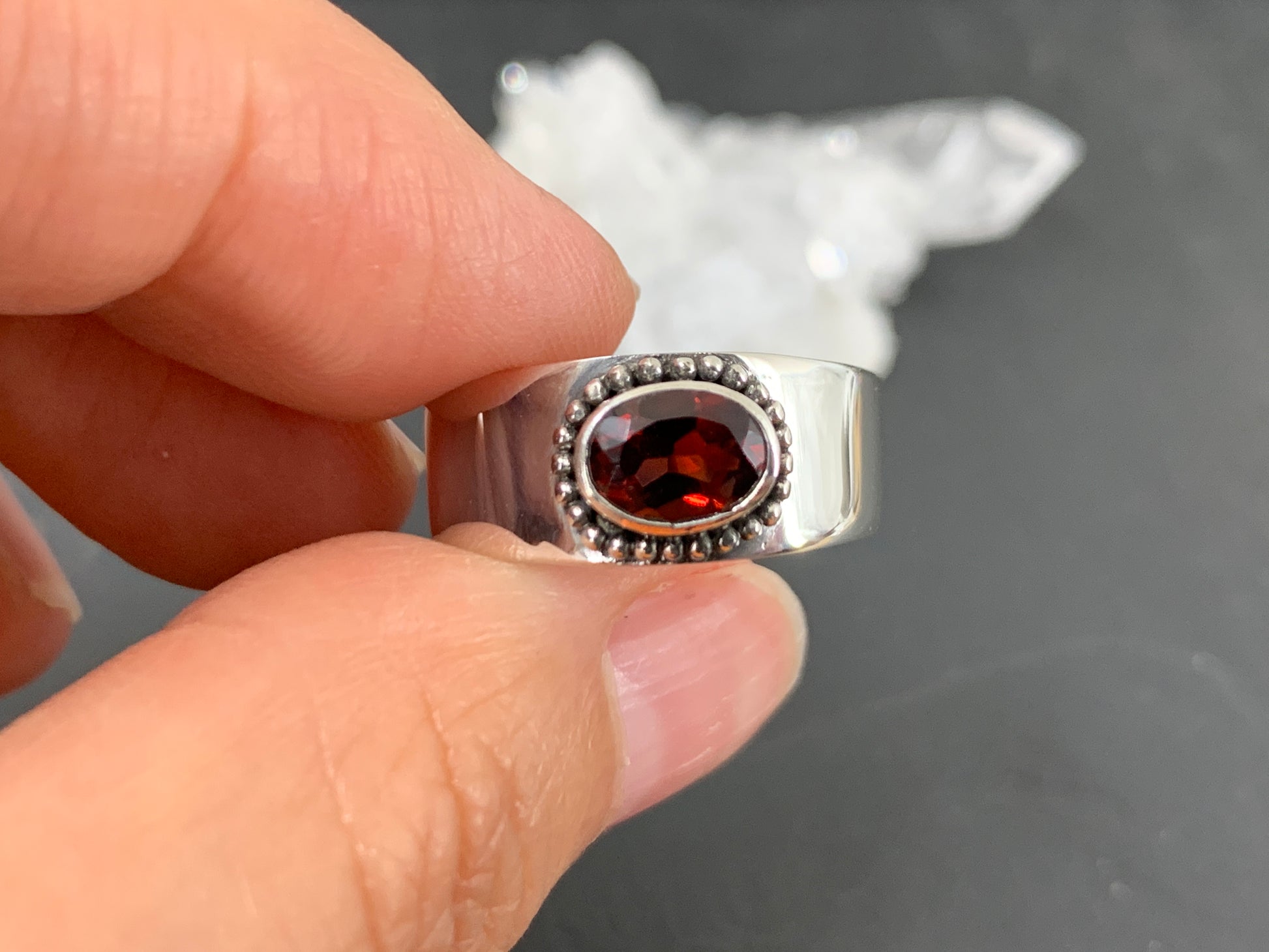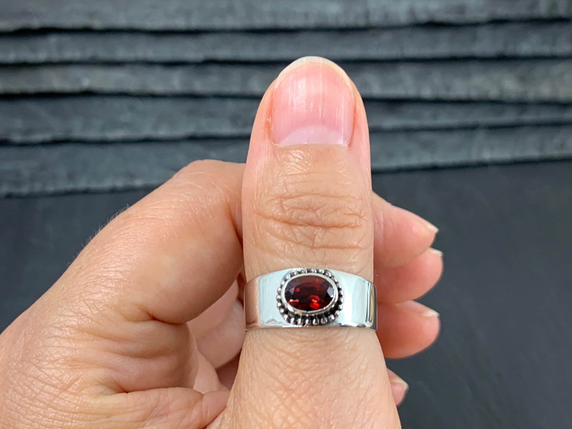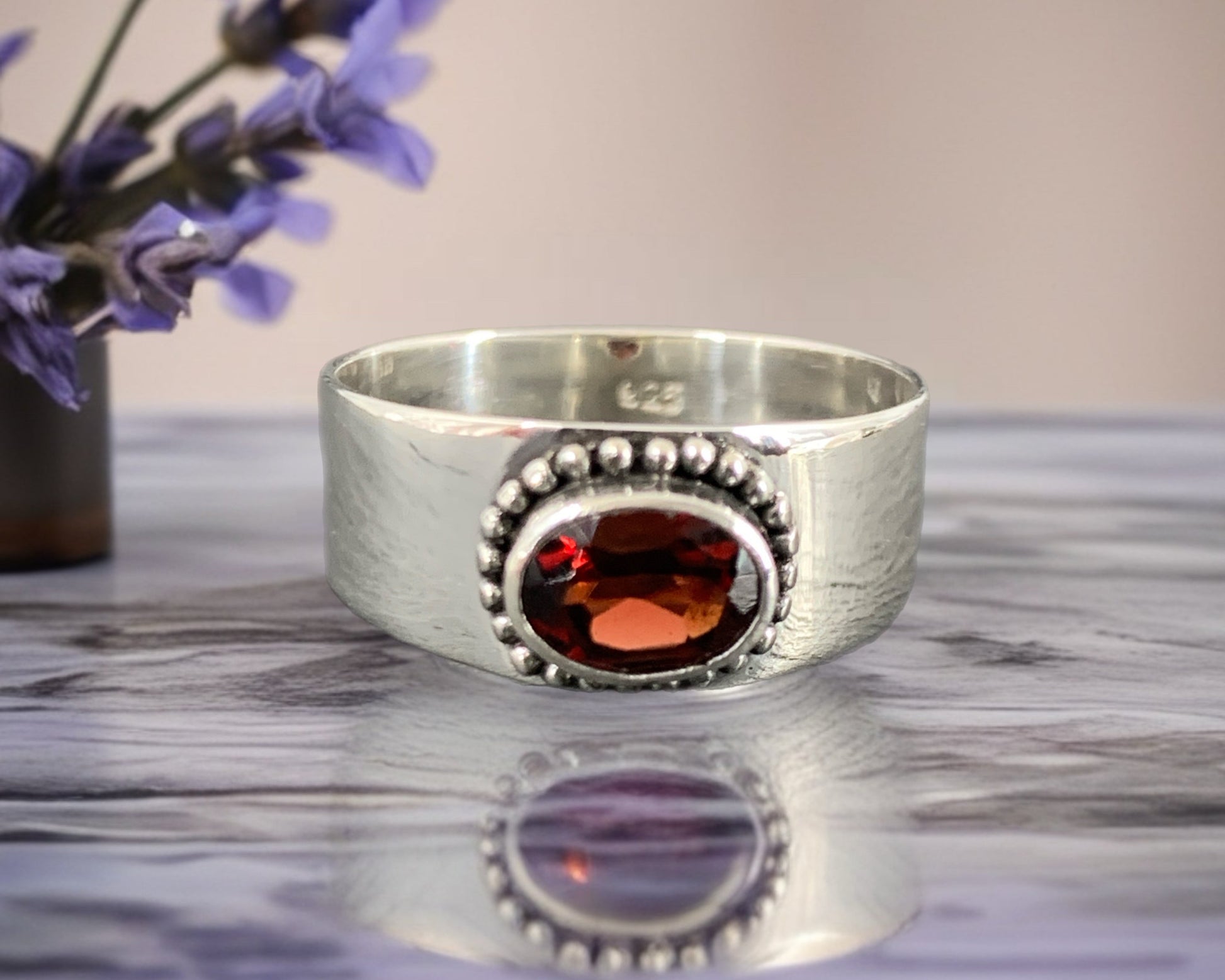 Sterling Silver Garnet Ring - Wide Band Statement Ring - size 8US
