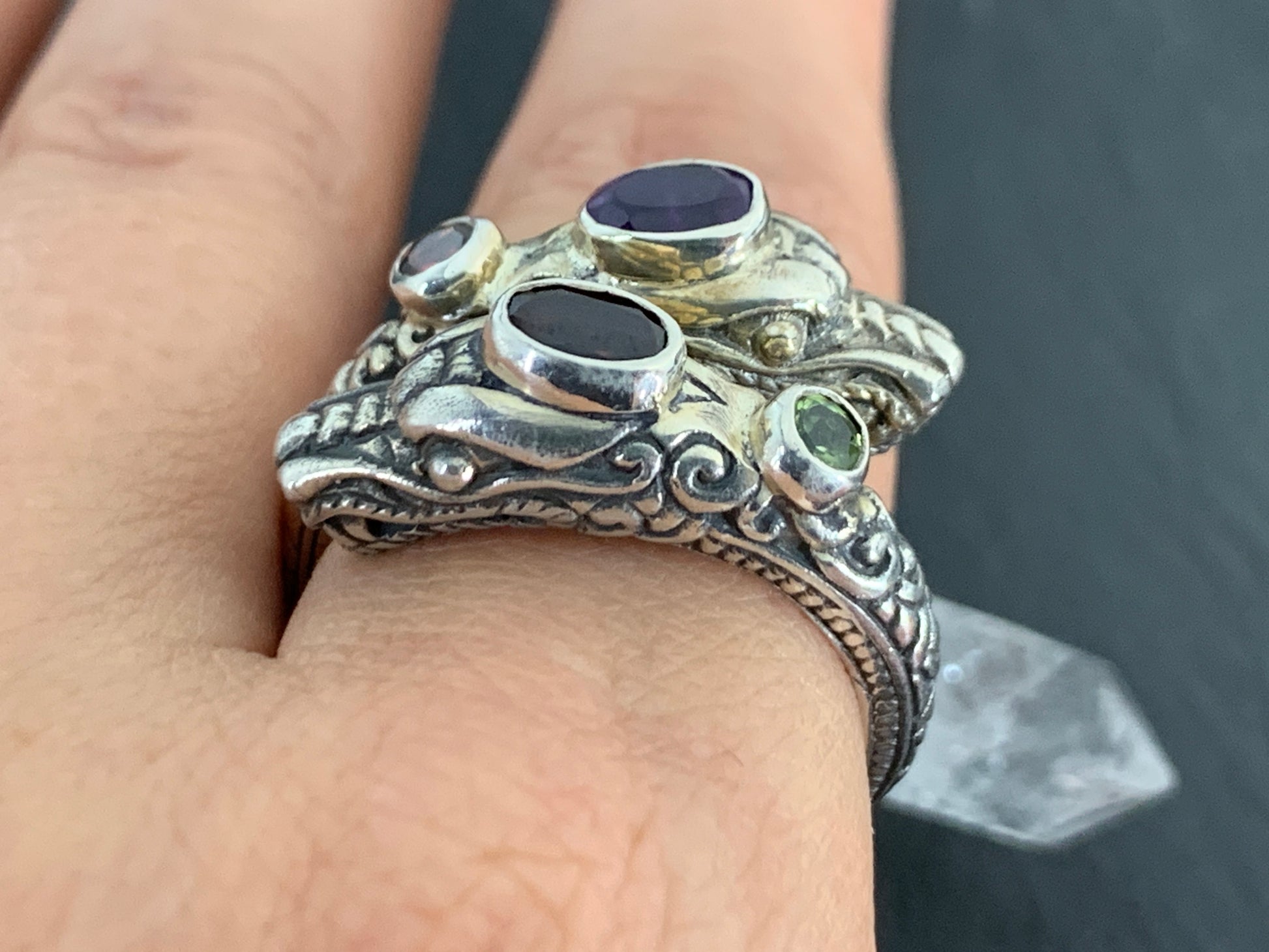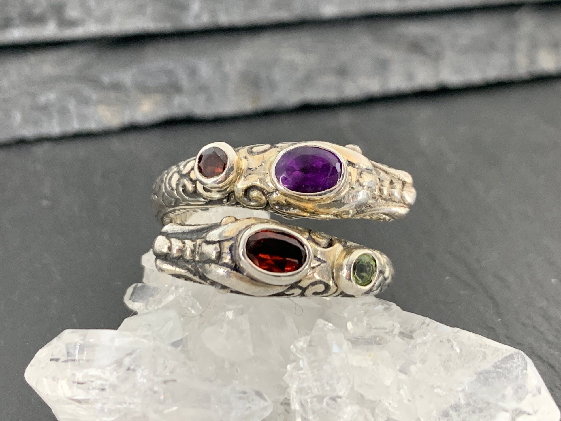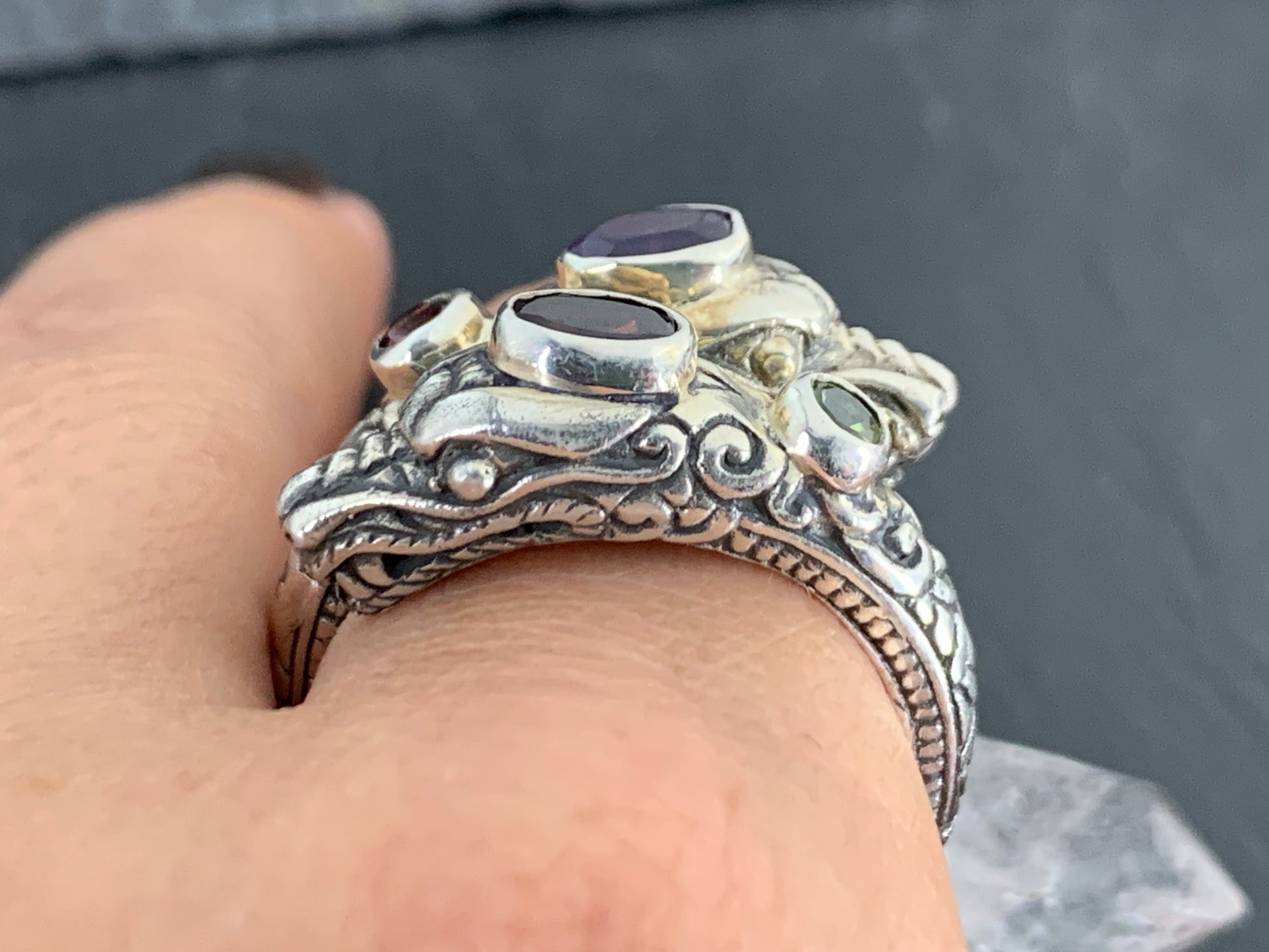 Sterling Silver Gemstone Rins – Amethyst, Peridot, Garnet. Ornate Boho Ring
