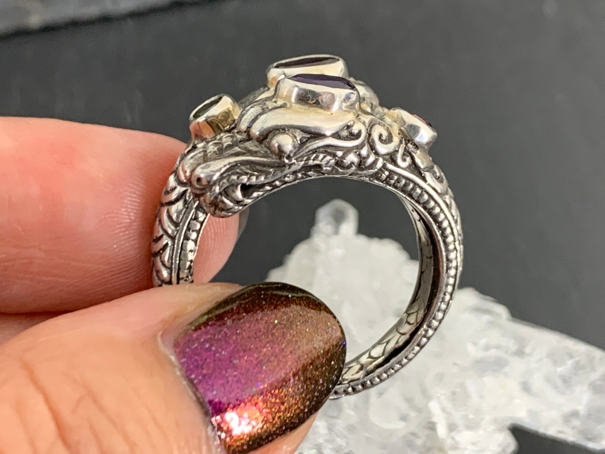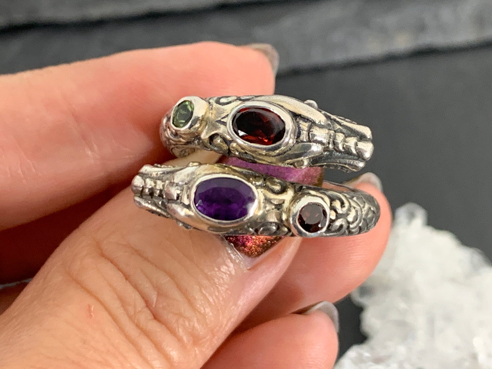 Sterling silver ring with gemstones: Amethyst, Peridot, Garnet