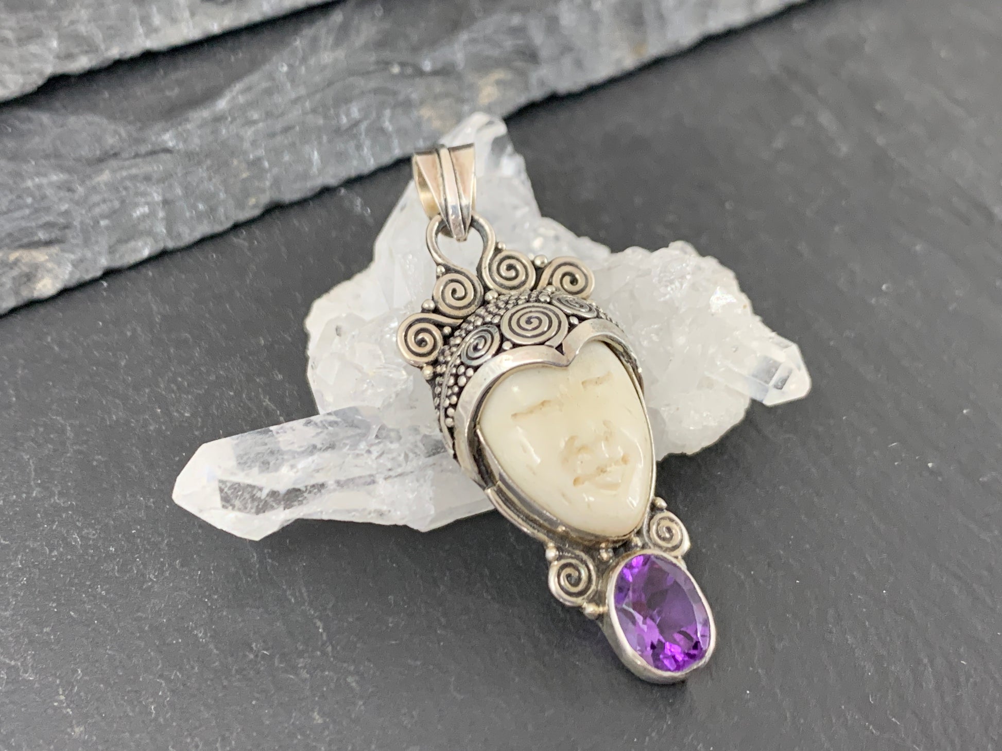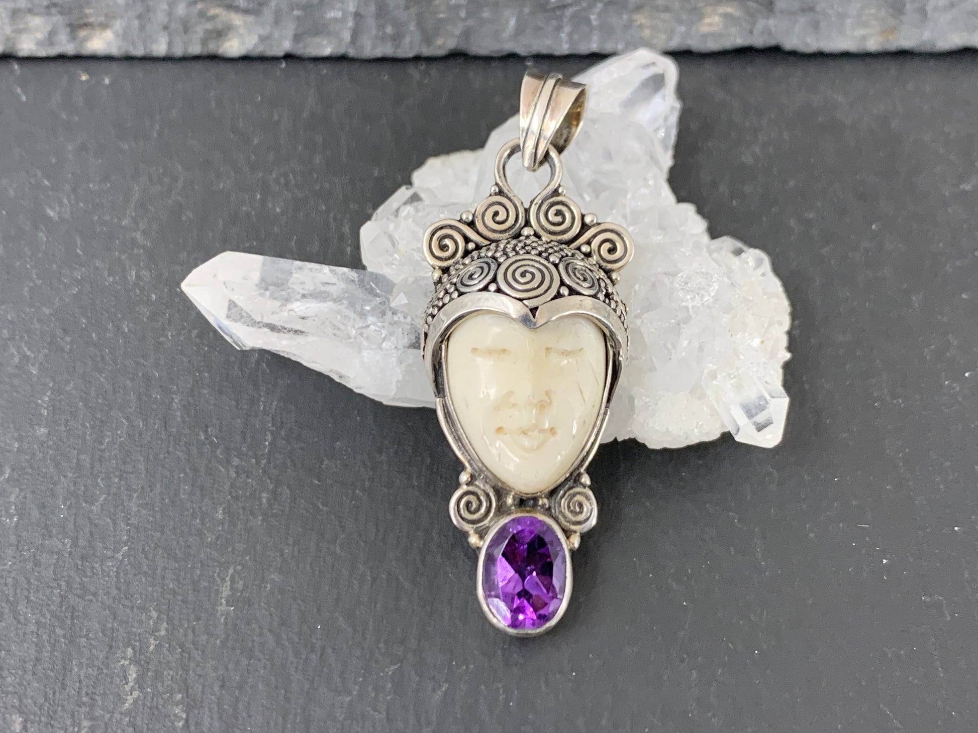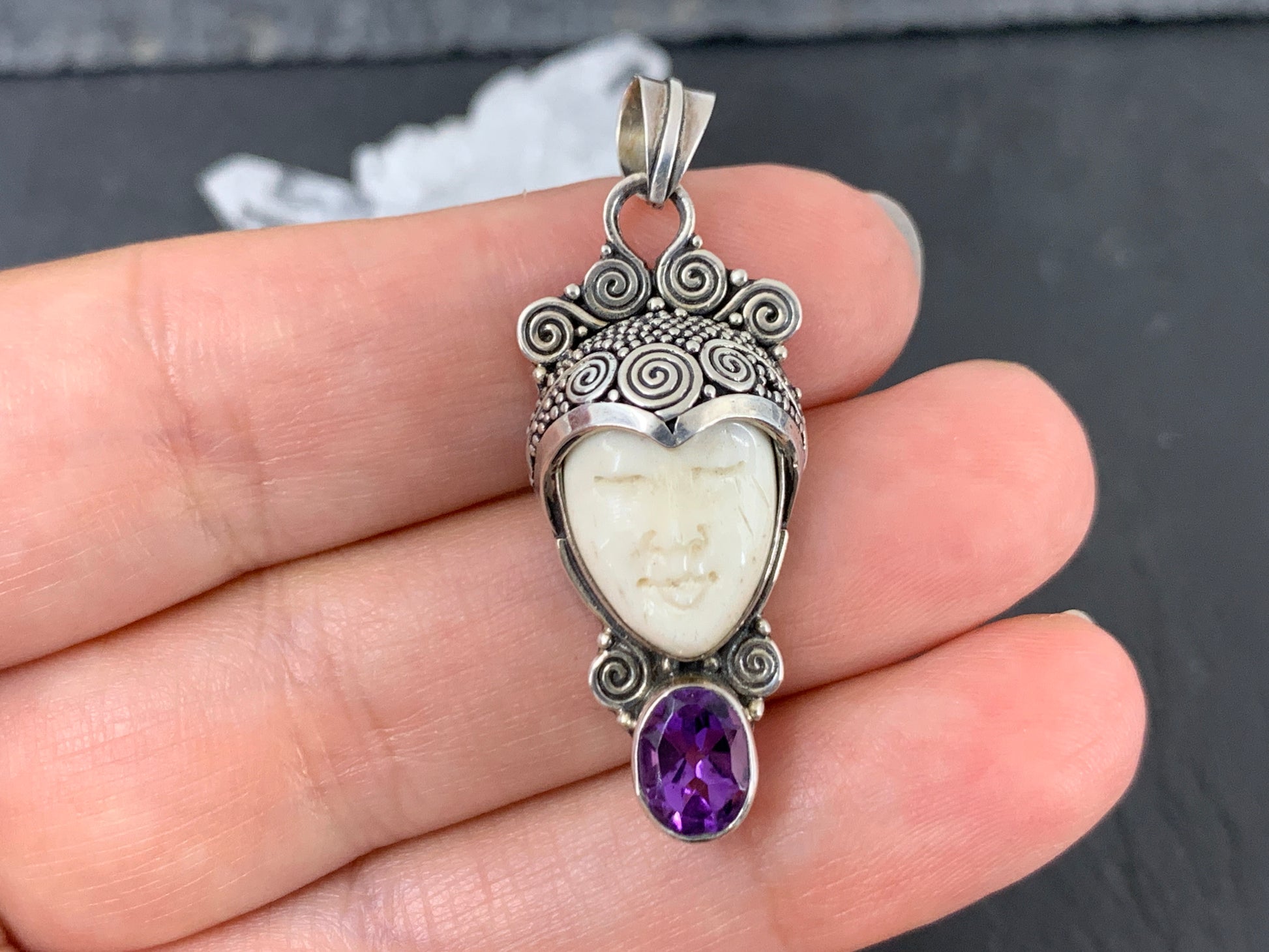 Channel celestial calm with this handcrafted sterling silver pendant featuring a serene goddess face carved from bone in a heart-shaped bezel. Crowned with intricate silver spirals symbolizing divine energy and transformation, this pendant radiates ethereal beauty and ancient feminine wisdom. Below the goddess rests a dazzling faceted amethyst, a stone of intuition, peace, and spiritual protection.