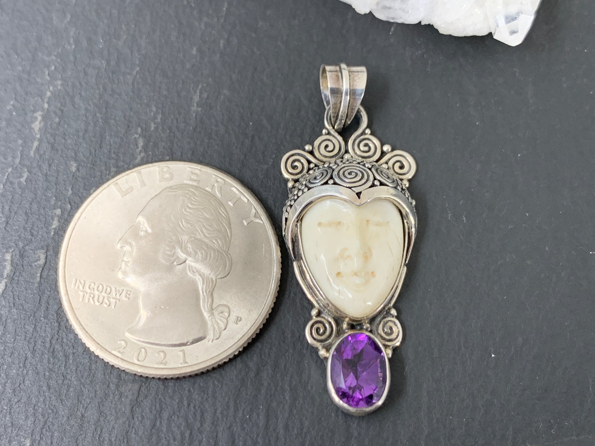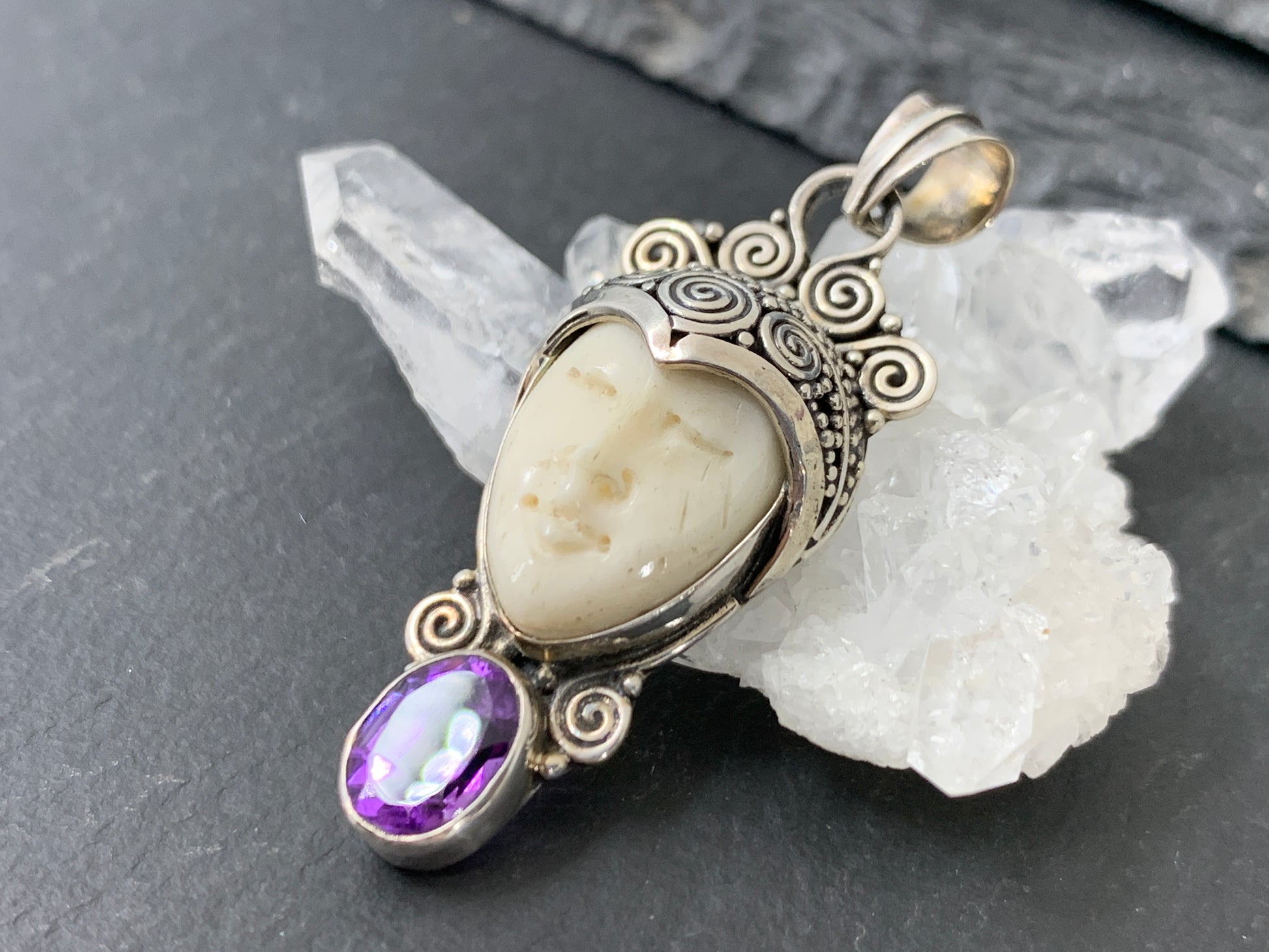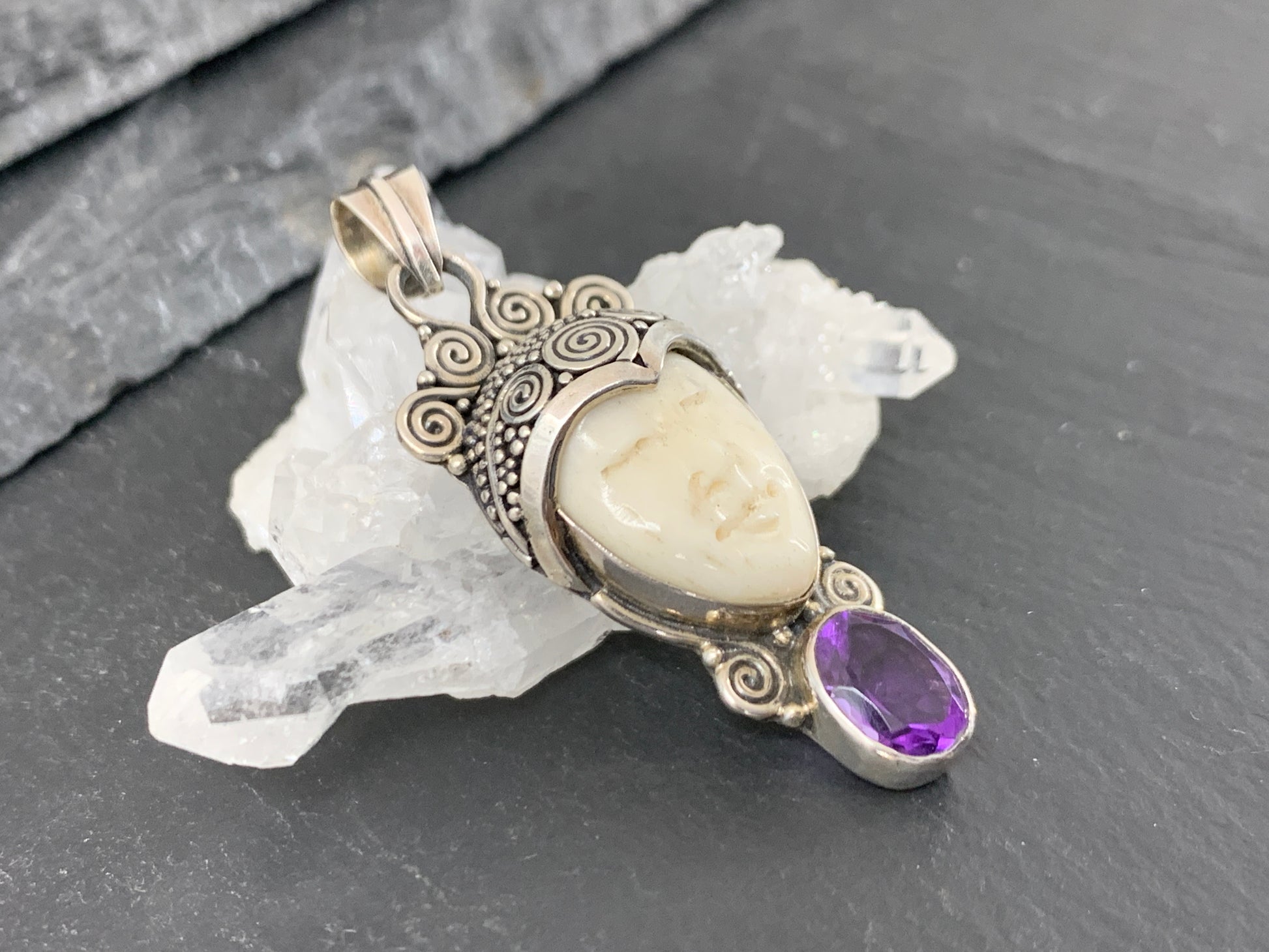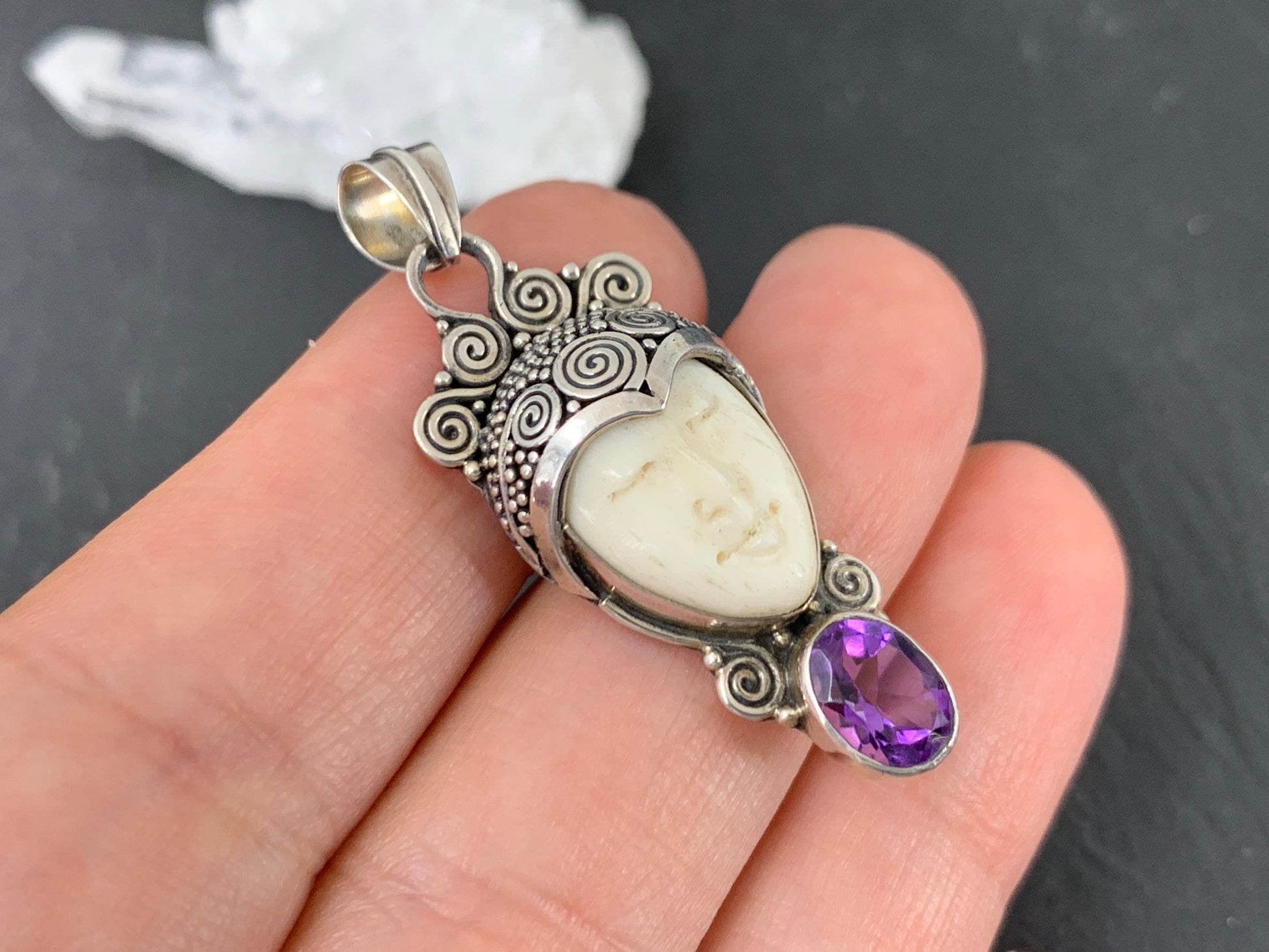 Channel celestial calm with this handcrafted sterling silver pendant featuring a serene goddess face carved from bone in a heart-shaped bezel. Crowned with intricate silver spirals symbolizing divine energy and transformation, this pendant radiates ethereal beauty and ancient feminine wisdom. Below the goddess rests a dazzling faceted amethyst, a stone of intuition, peace, and spiritual protection.