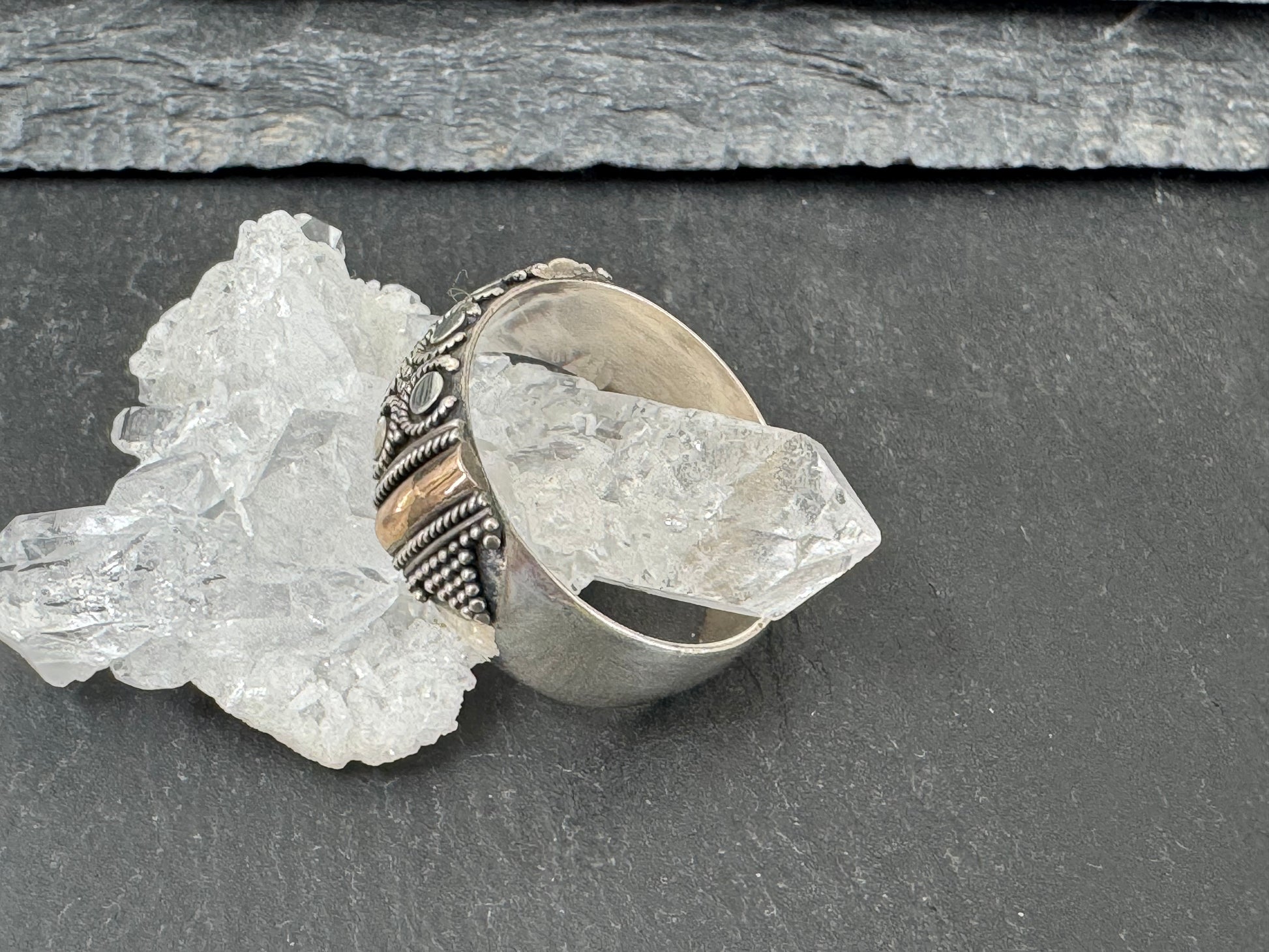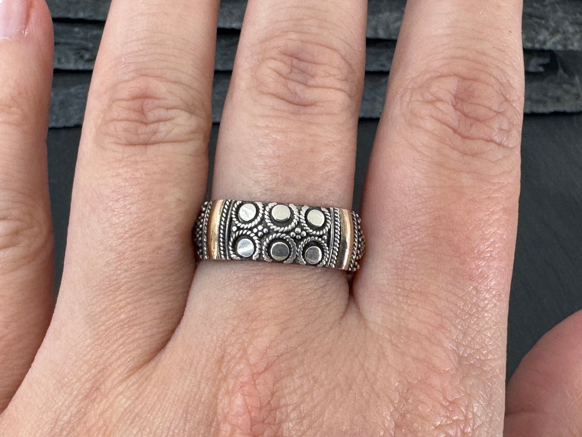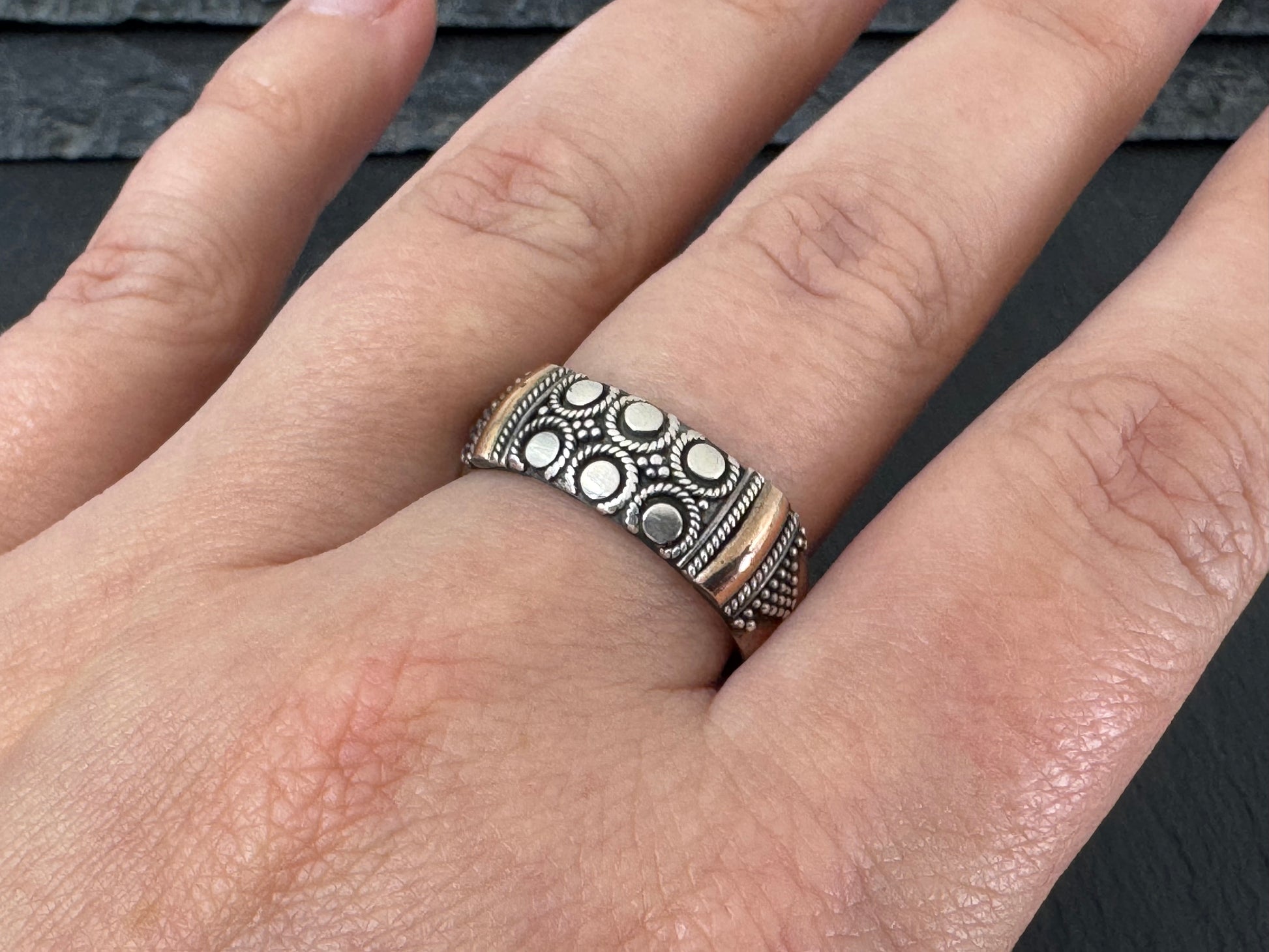 This ring has a bold, tribal-inspired design with oxidized silver detailing with touch of gold platting